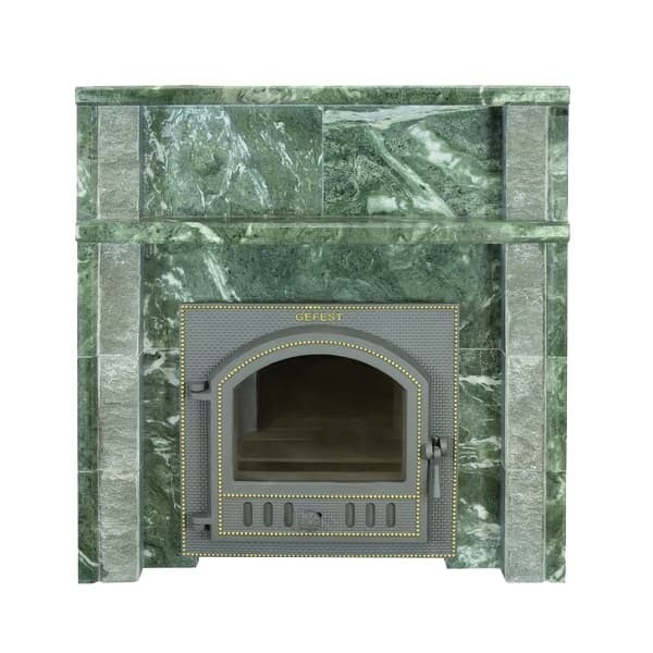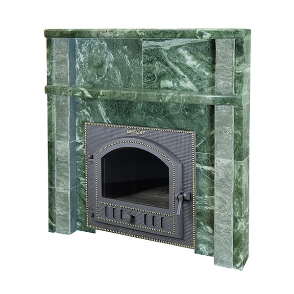 Мы предлагаем готовый портал из натурального камня змеевика, как практичное и стильное решение по оформлению портала Вашей печи в комнате отдыха. Он в сочетании с большой каминной дверкой печей позволит получать удовольствие наблюдая за огнем и защитит стены-перекрытия от возгорания. Его легко установить без использования каких либо вспомогательных герметиков и мастик.