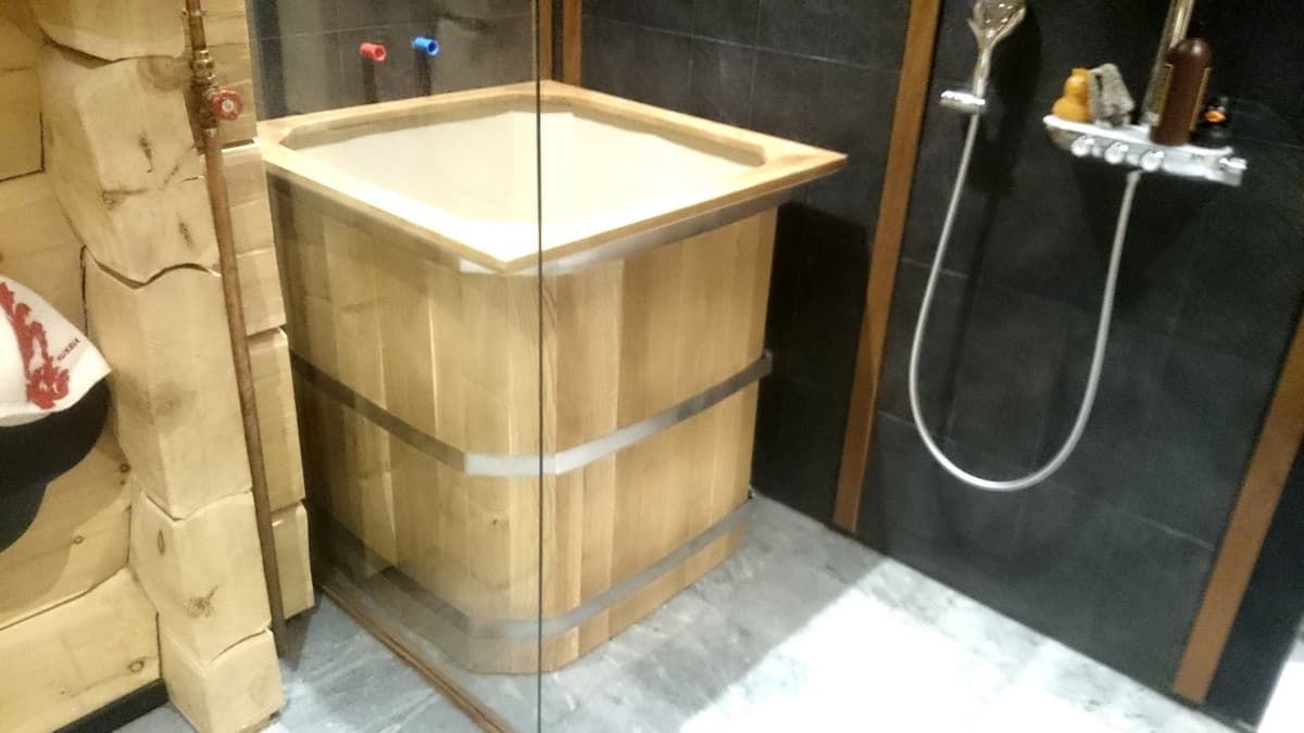 Прямоугольная купель с пластиковой вставкой высотой 1,2м подойдет для установки в баню или сауну. Хорошо принимать водные и закаливающие процедуры после парной.