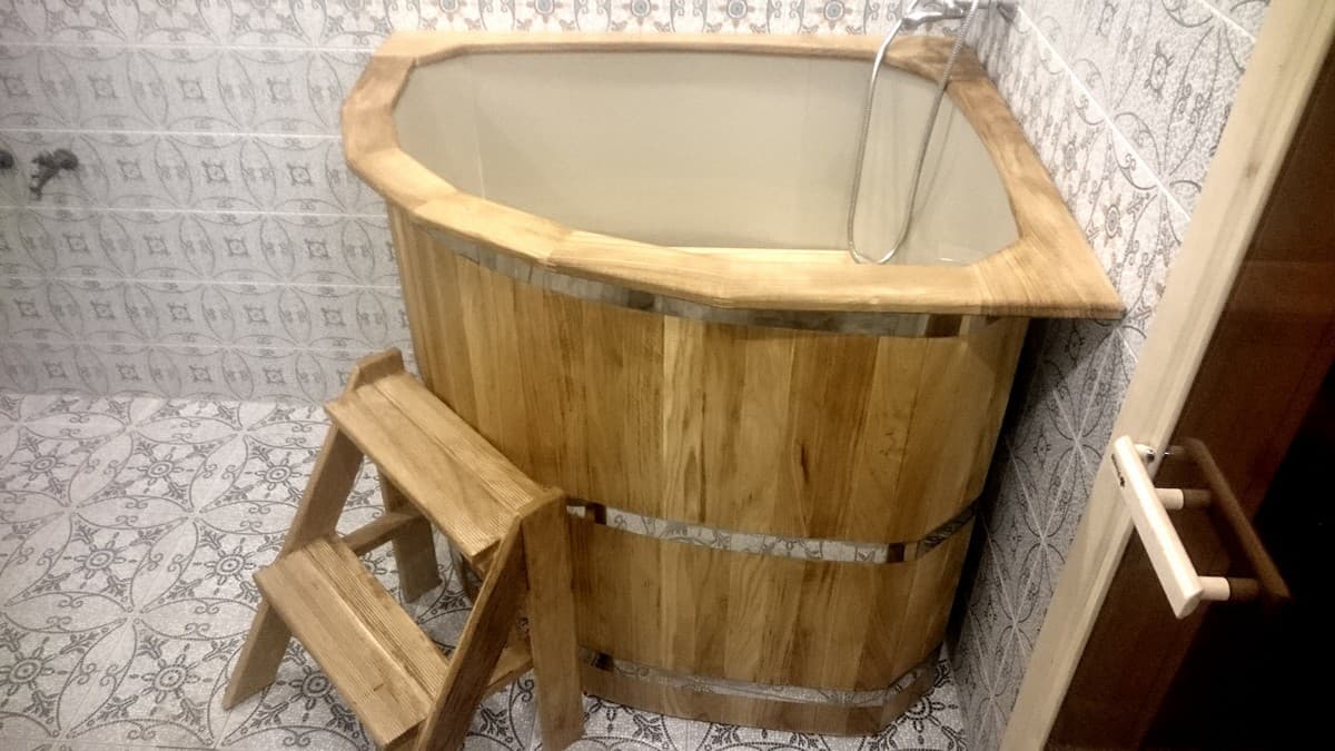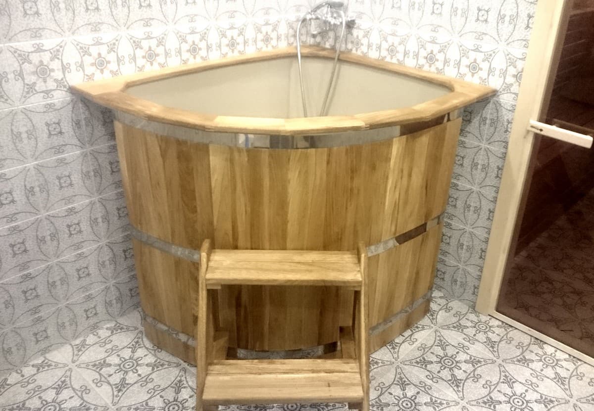 Угловая купель с пластиковой вставкой высотой 1,2м подойдет для установки в баню или сауну. Хорошо принимать водные и закаливающие процедуры после парной.