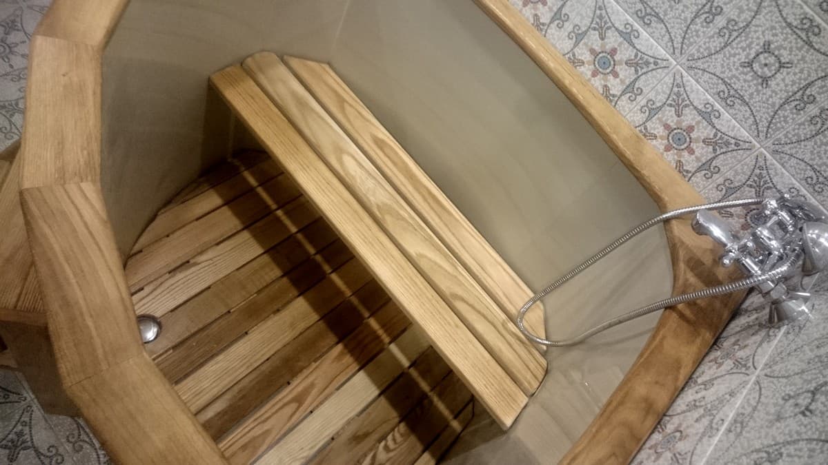 Покрытие купели в желаемый цвет придаст изделию выразительность, а также продлит срок службы. Используются только экологичные масло и воск, которые сохранят первозданный вид древесины, при этом не влияя на ее полезные свойства.