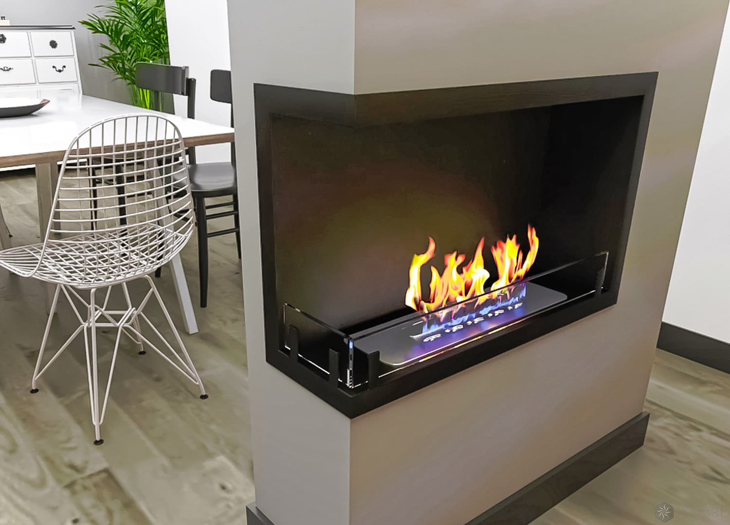 Встраиваемый очаг открывает живое пламя с двух сторон: впереди и слева. Он имеет увеличенный угол обзора и при этом не отнимает полезной площади помещения. Инсталлировать огненный декор можно в любые ненесущие конструкции: межкомнатную перегородку, выступающий угол или колонну, короб из гипсокартона или шкаф из МДФ.