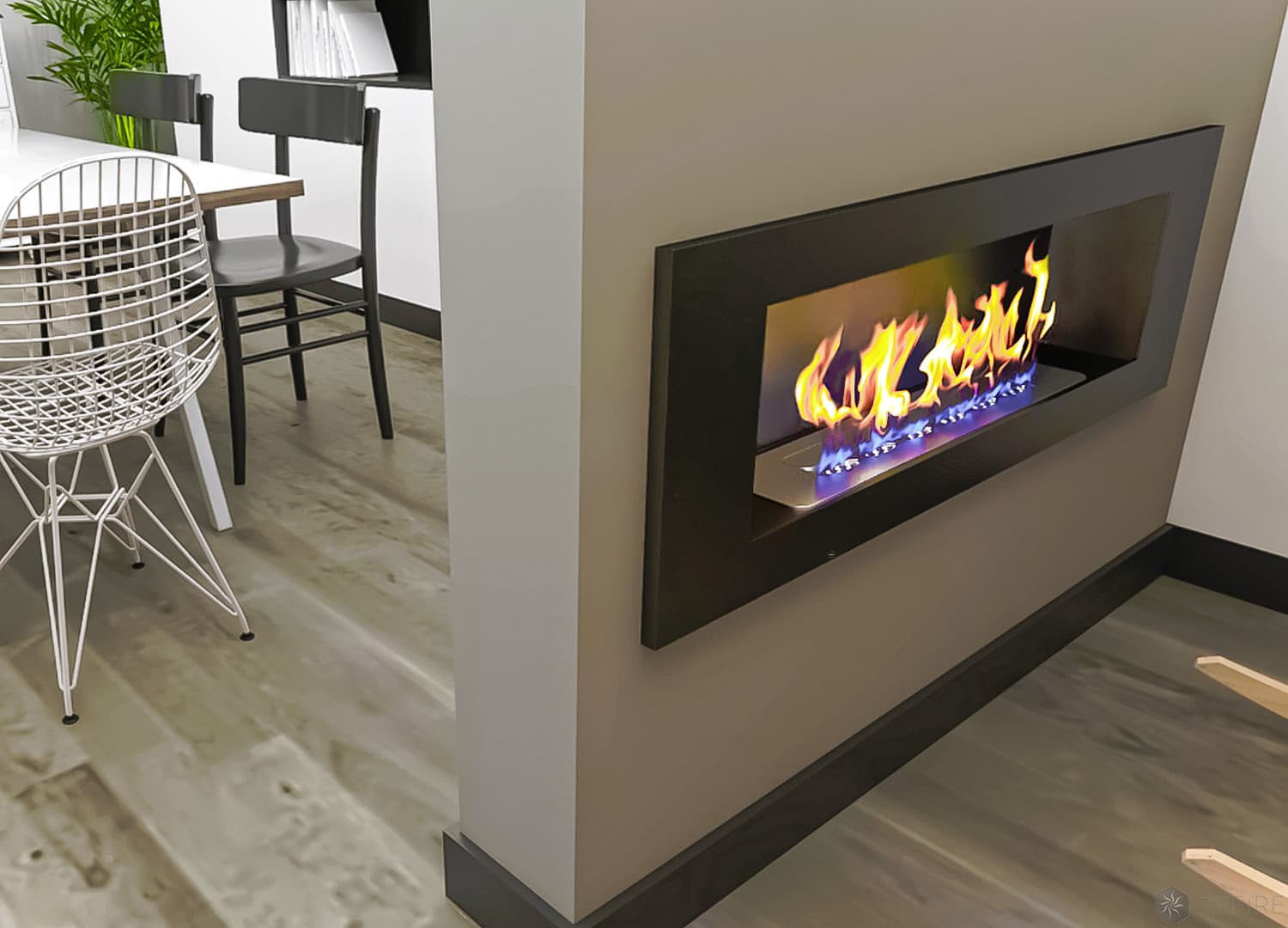 По способу установки биокамин Etude 1200 настенный и встраиваемый. Это значит, что его можно просто повесить на вертикальную поверхность с помощью дюбель-гвоздей или шурупов, как картину. Или встроить в нишу в перегородке, коробе из гипсокартона или мебели из МДФ. В последнем случае очагу потребуется несложная теплоизоляция, например, с помощью минеральной ваты и фольги.
