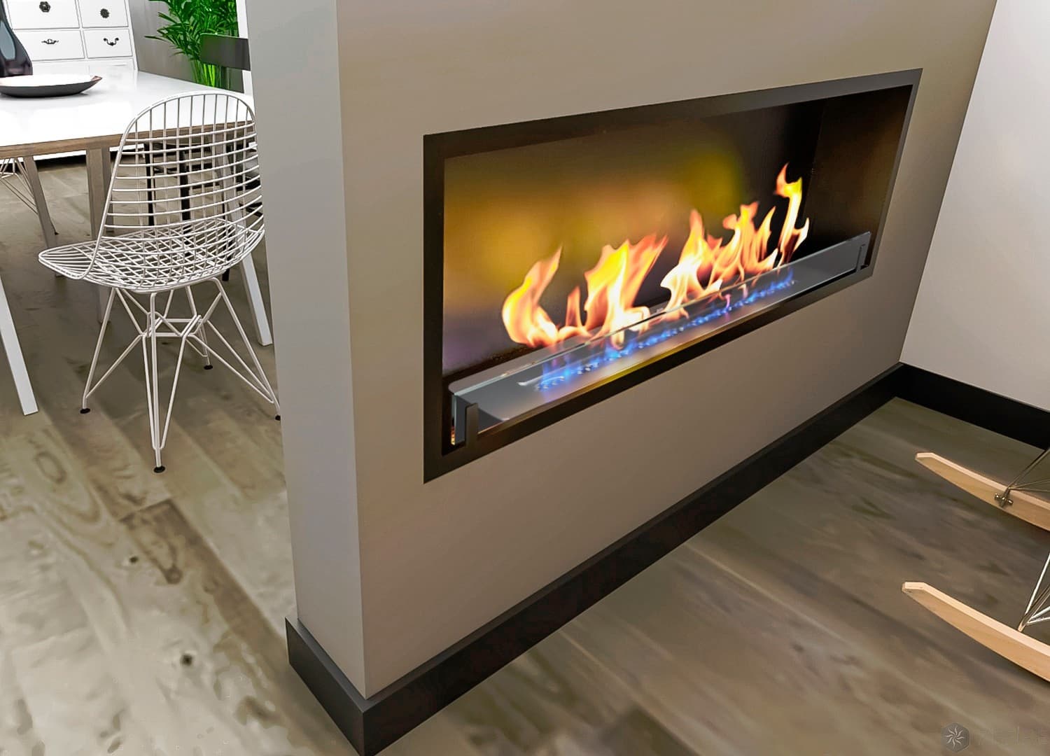 Биокамин работает на жидком экологичном топливе. Состав на спиртовой основе при сгорании не выделяет дыма, гари и копоти. Поэтому устройство не привязано к коммуникациям и его можно инсталлировать в любую ненесущую конструкцию. В том числе – в короб из гипсокартона или мебель из МДФ. Для теплоизоляции в последнем случае достаточно минеральной ваты и фольги.