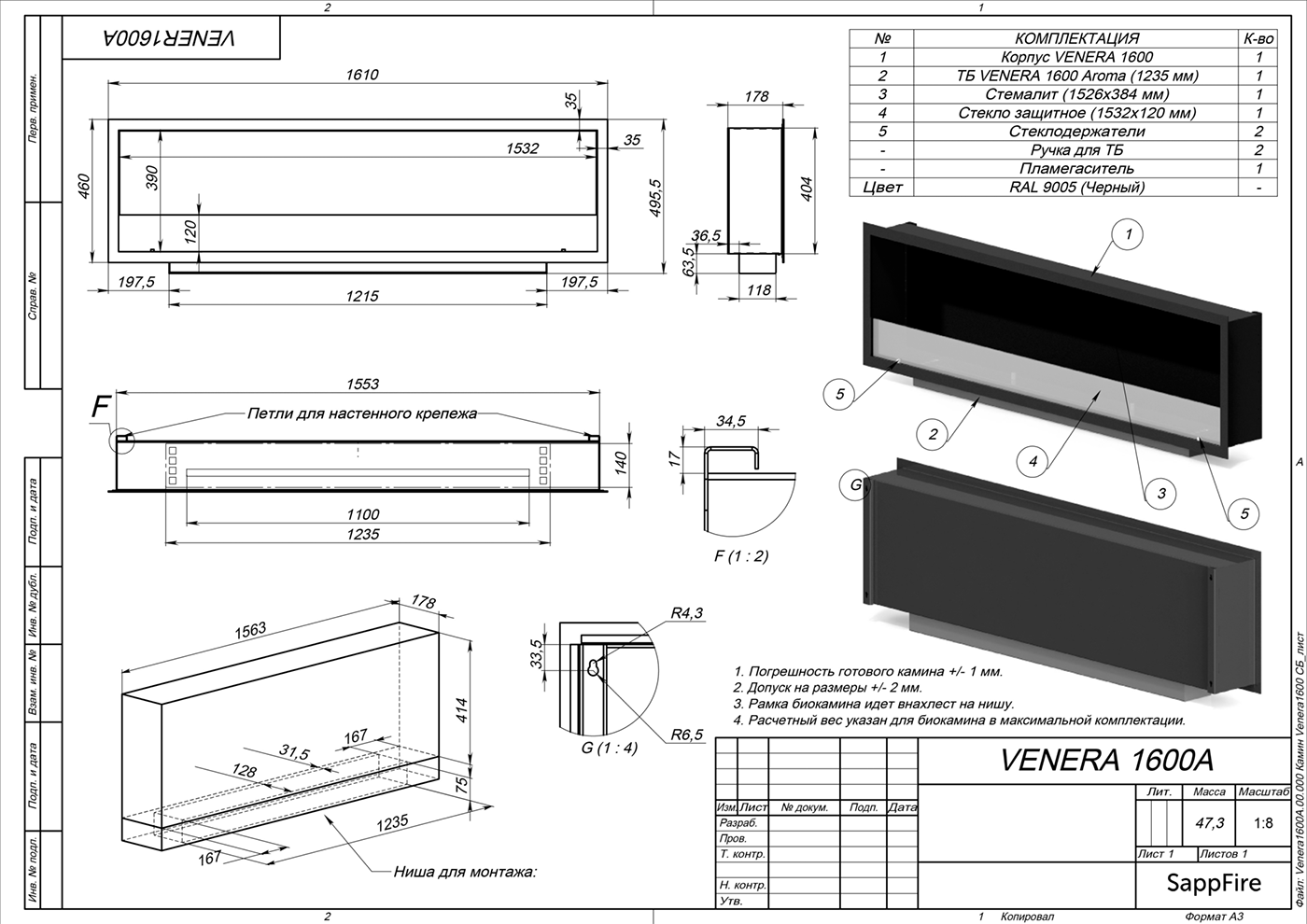 Гарантия на биокамин Venera 1600 составляет 5 лет. Вы можете быть уверены в том, что он прослужит вам долгие годы, создавая тепло и уют в вашем доме. Не упустите возможность преобразить ваше пространство с помощью биокамина Venera 1600 от SappFire. Это не просто предмет интерьера, а элемент стиля, который сделает ваш дом более комфортным и привлекательным.