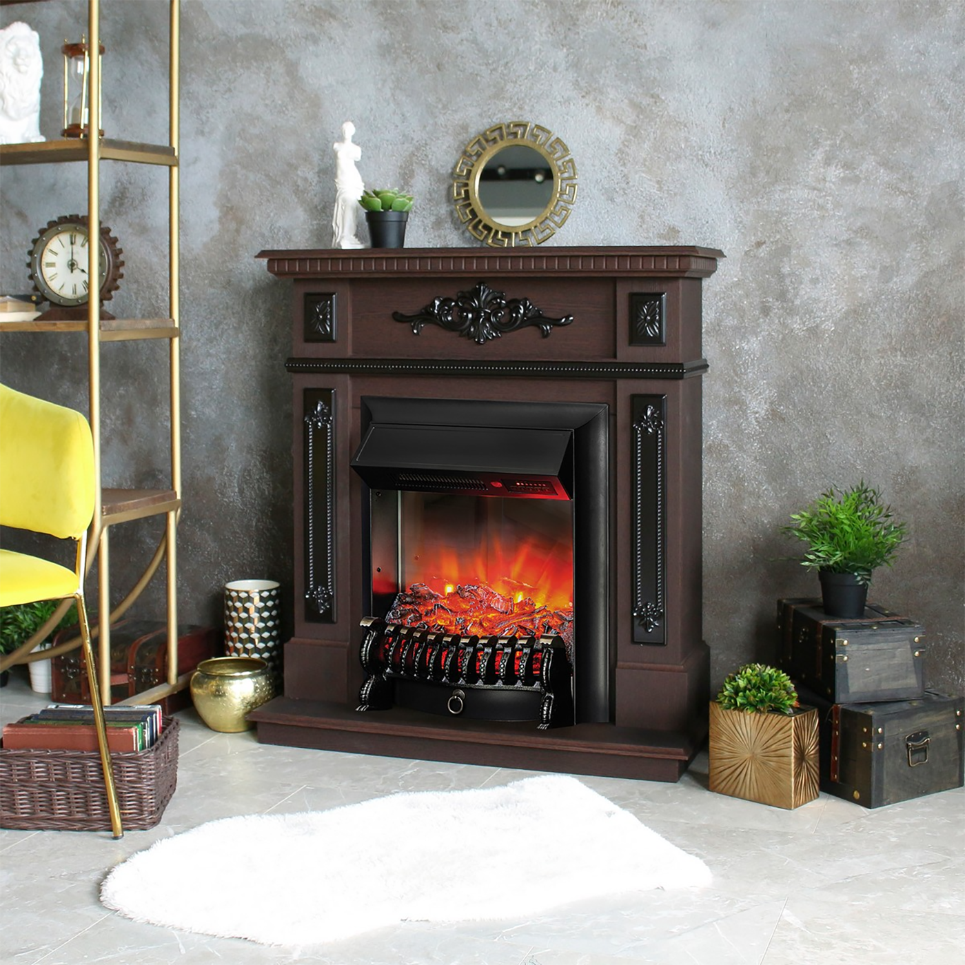 Портал Lilian в цвете DN-F817 "темный орех" в комплекте со стандартным очагом Fobos Lux BR S. Эффектный классичечский стиль обрамления подойдёт для различных интерьеров.