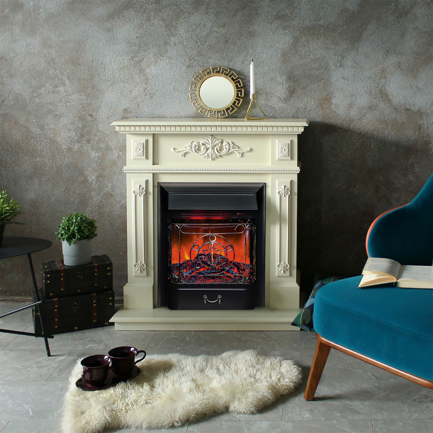 Портал Lilian в цвете WT-F617 "белый дуб" в комплекте со стандартным очагом Majestic Lux BL S. Эффектный классичечский стиль обрамления подойдёт для различных интерьеров.