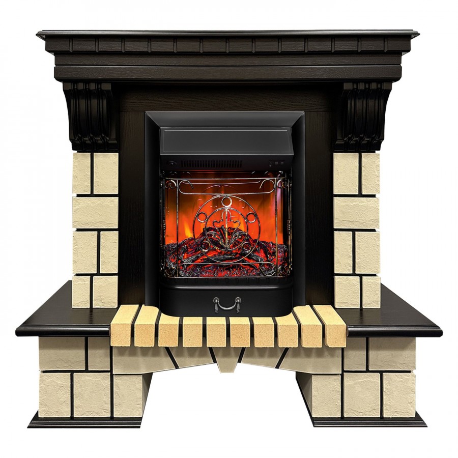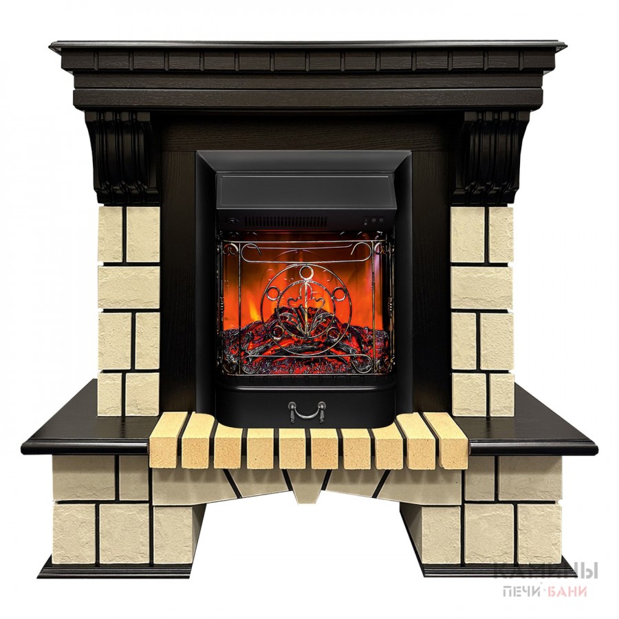 Каменный портал Stone изготовлен из из искусственного камня и шпонированного МДФ. Очаг с открытым муляжом выполнен в точной копии тлеющих углей и небольших поленьев. Оригинальности и схожести с натуральным камином добавляет ажурная кованая решетка и звук потрескивания дров.