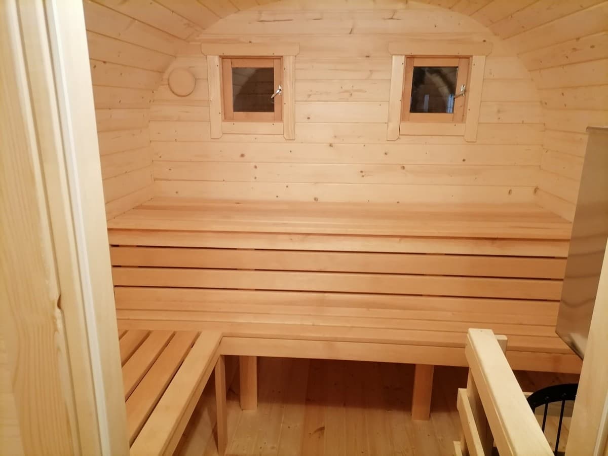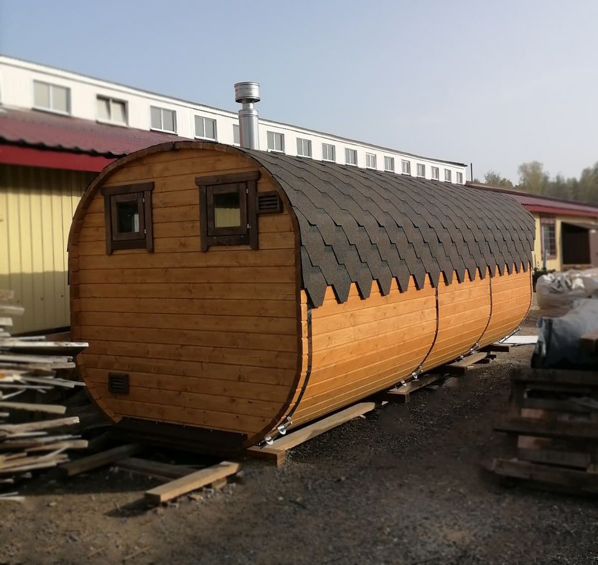 Баня бочка 5 метров на 2 отделения, устанавливается на деревянные клееныебрусья. Изготовлена из з отборной хвои, просушенной до 8% влажности.Снаружи обработана защитными составами для древесины в 2 слоя. Имеет 2полки и трапик на пол из липы или осины на каждое помещение. Дляобогрева установлена дровяная печь в сборе с дымоходоми баком. Каменная засыпка в печи из габбро-диабаза. За печьюи под ней для обеспечения пожарной безопасности устроена защита отнагрева из минерита. Встроены регулируемые вентиляционные решетки.Накрыта крышей из гибкой кровли. Встроена дверь комбинированнаядерево+стекло с ручками, наличниками и замком на каждое помещение.Обвязана обручами из нержавеющей стали с регулируемыми замками. Комплектосвещения и электрики.