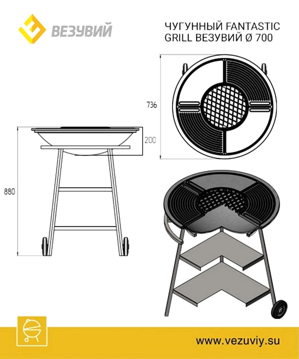 Подставка для Везувий Fantastic Grill Ø 700 изготовлена из стального профиля квадратного сечения. Она чётко рассчитана для этой модели гриля.Высота подставки 755 мм, глубина (с ручкой для перемещения) – 670 мм, ширина 610 мм. Вес подставки 9,9 кг.Подставка оснащена ручкой с лицевой стороны, двумя колёсами для облегчения передвижения и двумя полочками для хранения аксессуаров в середине и дров в нижней части подставки.