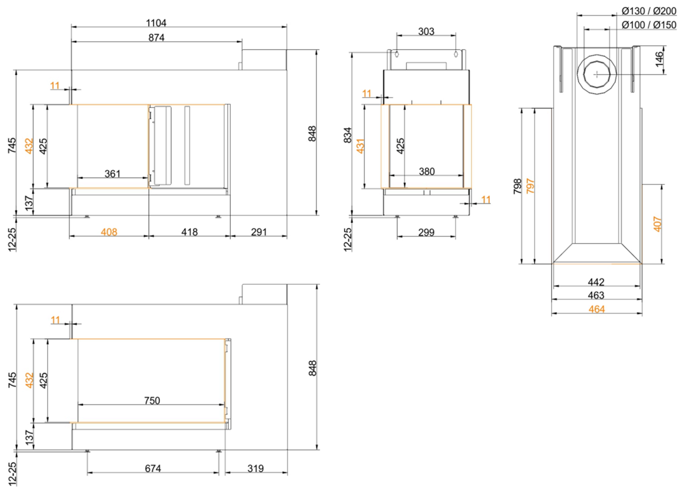 Чертеж газового камина Panorama 43/75/38/36