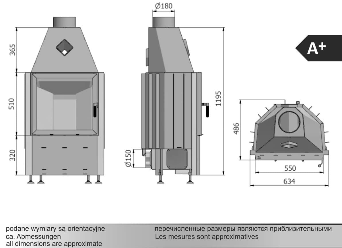 - Ножкии винты для регулировки вставки и компенсации неровностей пола, контейнерс патрубком для подачи воздуха для горения снаружи здания – удобствоустановки