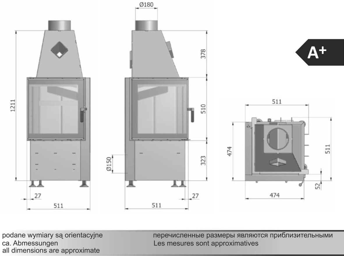 - Ножкии винты для регулировки вставки и компенсации неровностей пола, контейнерс патрубком для подачи воздуха для горения снаружи здания – удобствоустановки