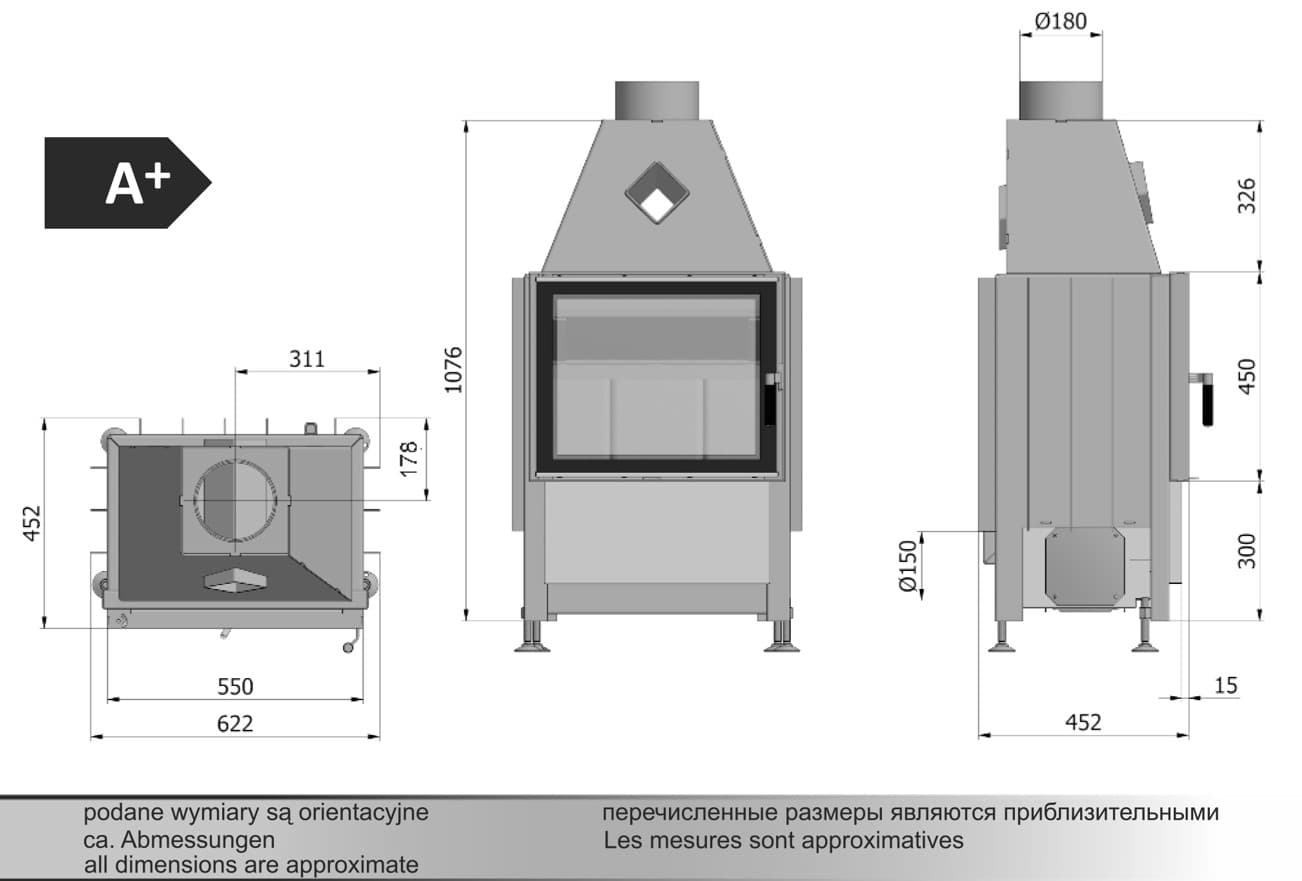 - Ножкии винты для регулировки вставки и компенсации неровностей пола, контейнерс патрубком для подачи воздуха для горения снаружи здания – удобствоустановки