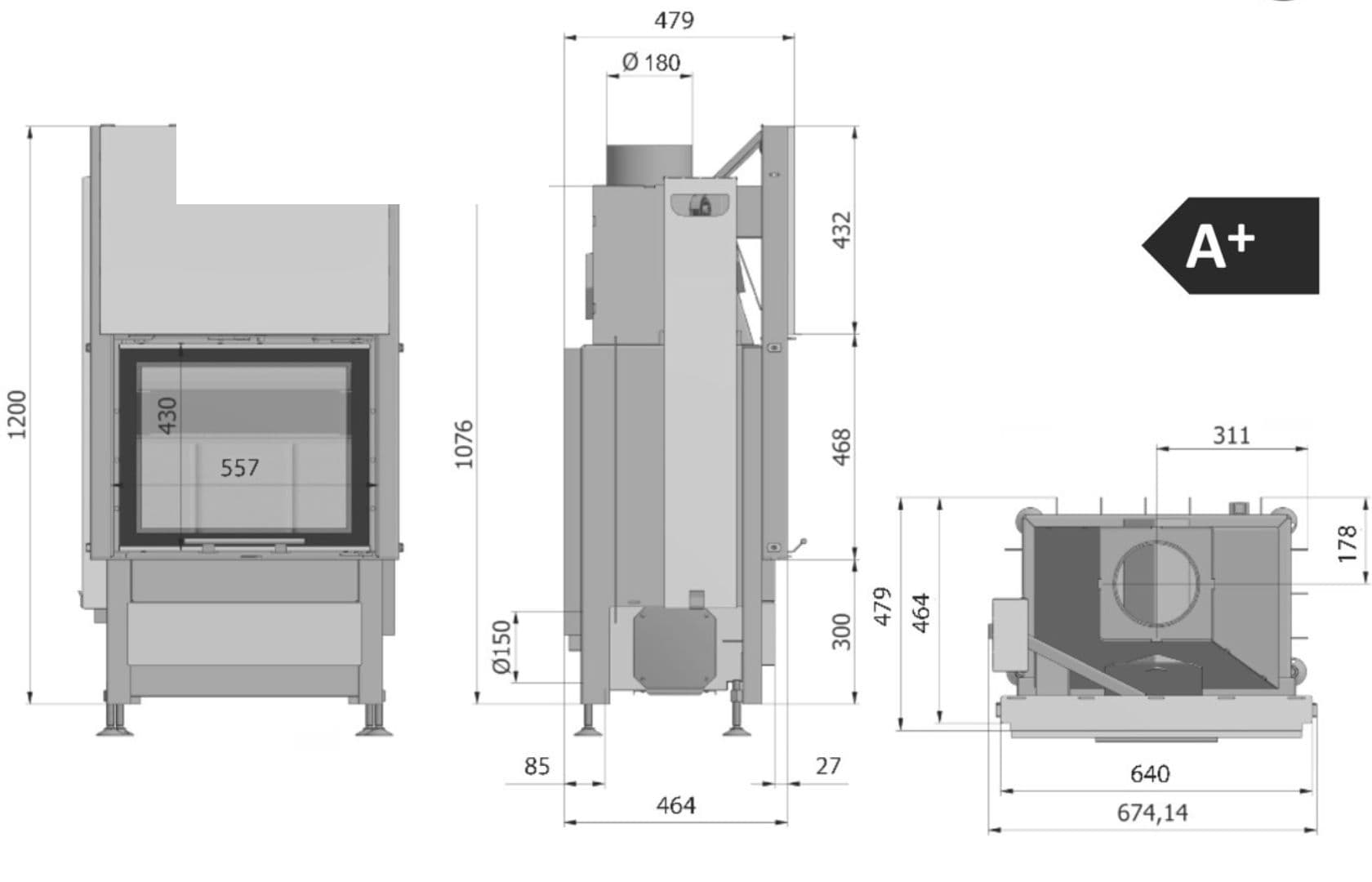 - Ножкии винты для регулировки вставки и компенсации неровностей пола, контейнерс патрубком для подачи воздуха для горения снаружи здания – удобствоустановки