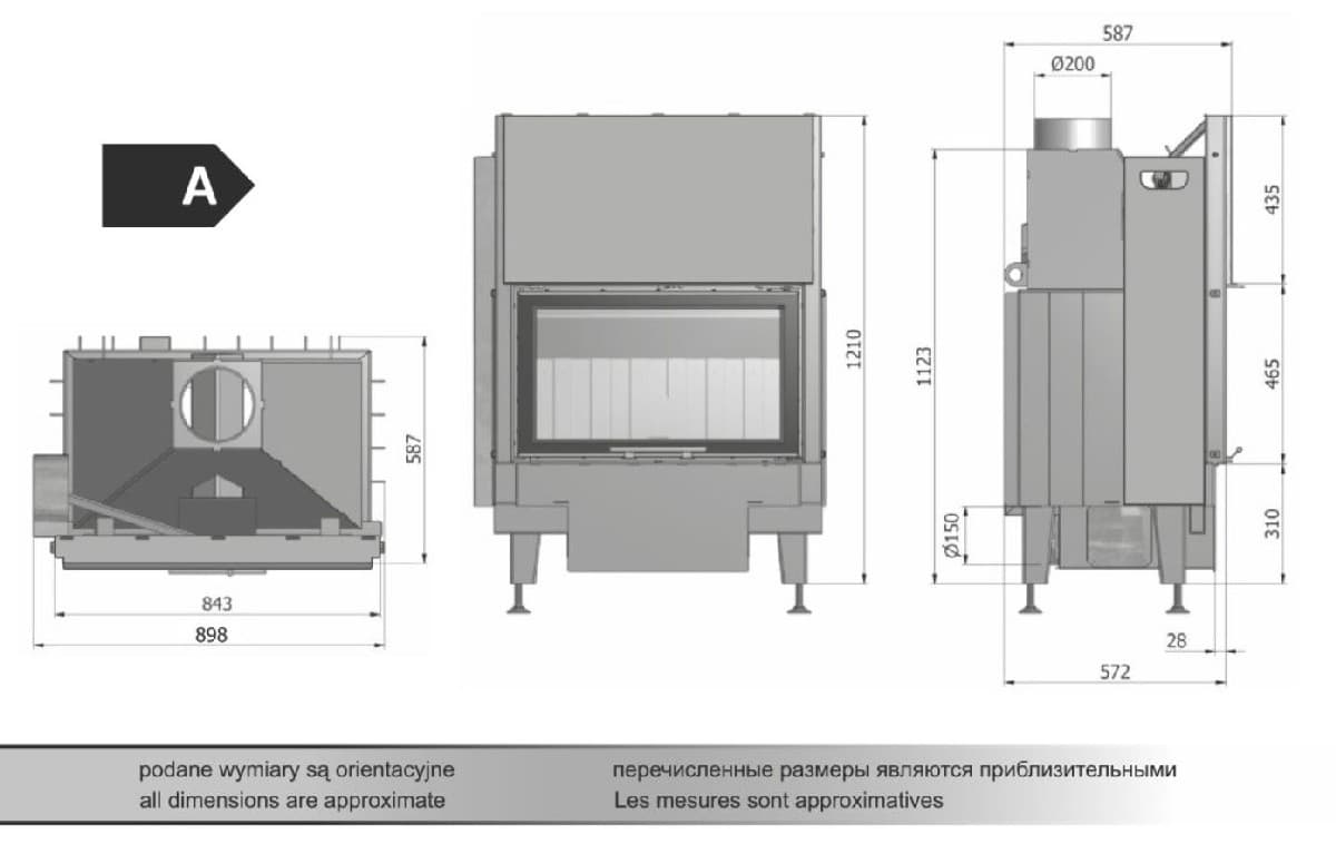 - Ножкии винты для регулировки вставки и компенсации неровностей пола, контейнерс патрубком для подачи воздуха для горения снаружи здания – удобствоустановки