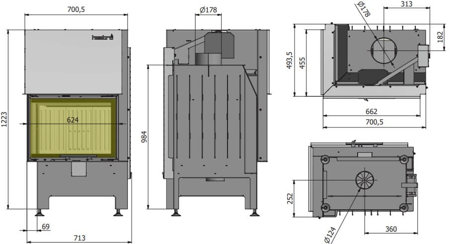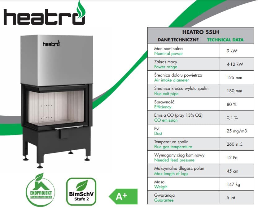 Каминная топка Heatro 55LH - каминная топка из стали с накопительной керамикой и системой подъема двери. Камин имеет современное угловое остекление типа «Full Glass» (боковое стекло слева) с эргономичной ручкой для открывания из нержавеющей стали.