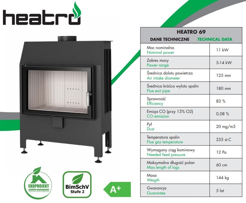 Каминная топка Heatro 69 - топка из стали с накопительной керамикой и открытием дверцы в сторону. Дверца имеет полное остекление.