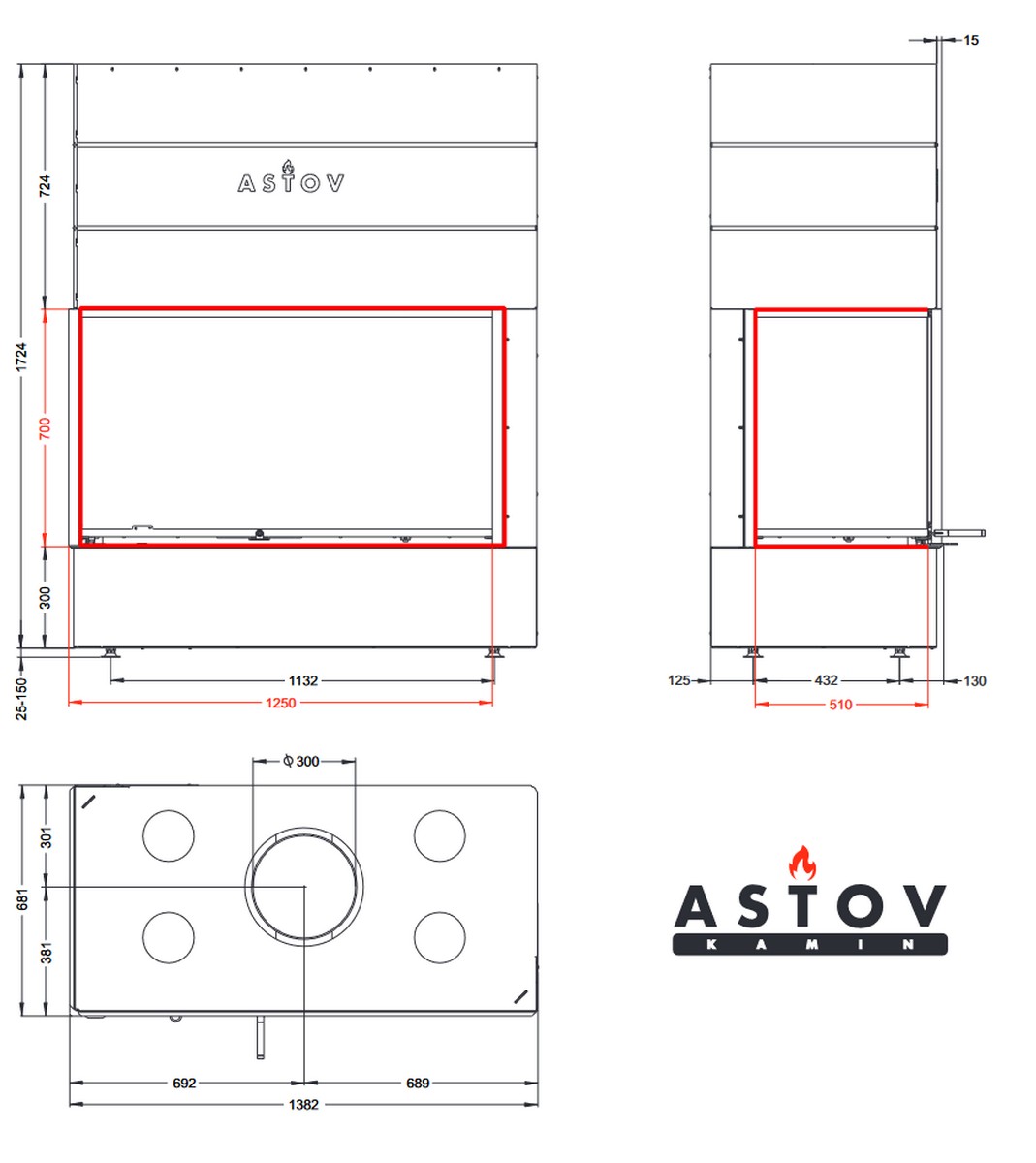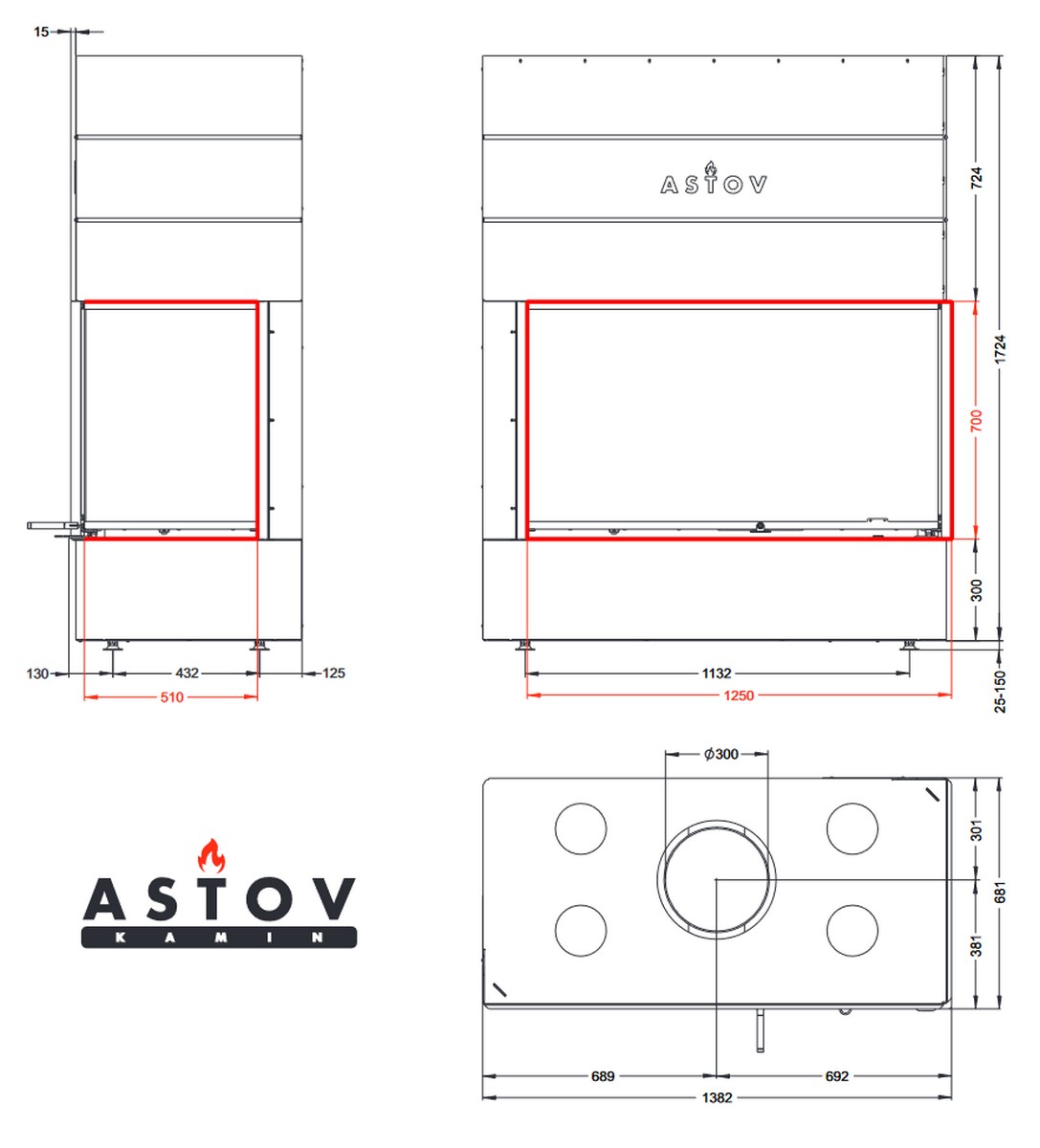 Каминная топка АСТОВ П2С 12570 L/P - левый и правый вариант углового расположения