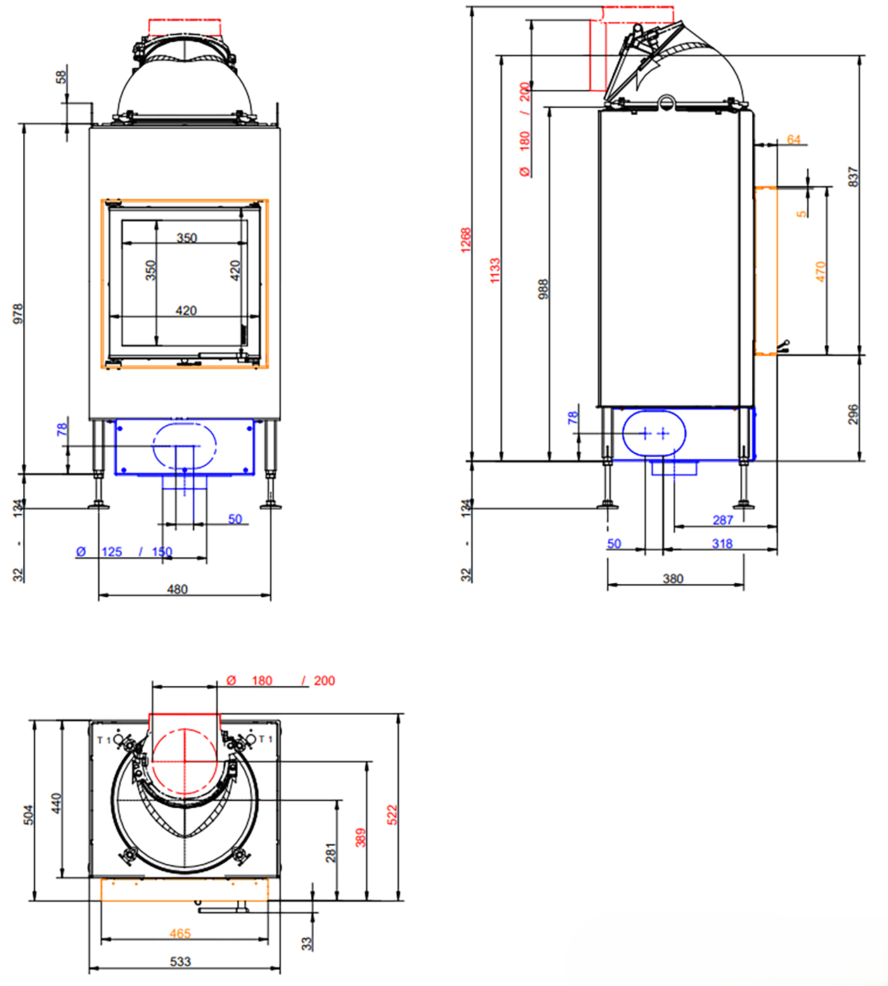 Каминная топка может быть оснащена дымосборниками различных типов: