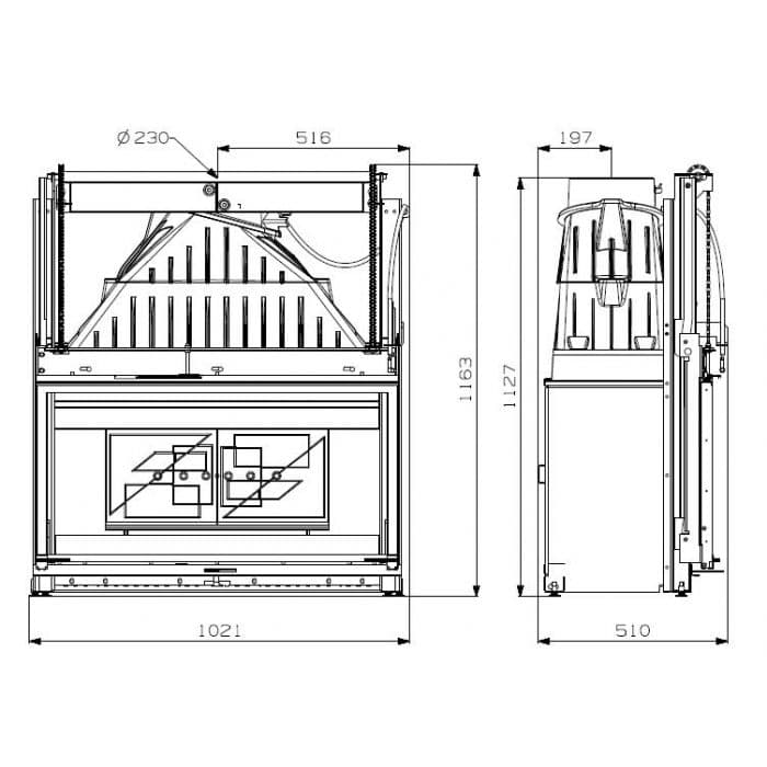 Такая топка может использоваться, как для встроенных, так и для пристенных каминов. Горизонтальная камера не только облегчает закладку дров, но и увеличивает вид огня. Очаг облицован специальным жаростойким материалом, который защищает от прогорания корпус и увеличивает теплоотдачу. Обдув стекла потоком воздуха гарантирует безупречную чистоту смотрового окна.