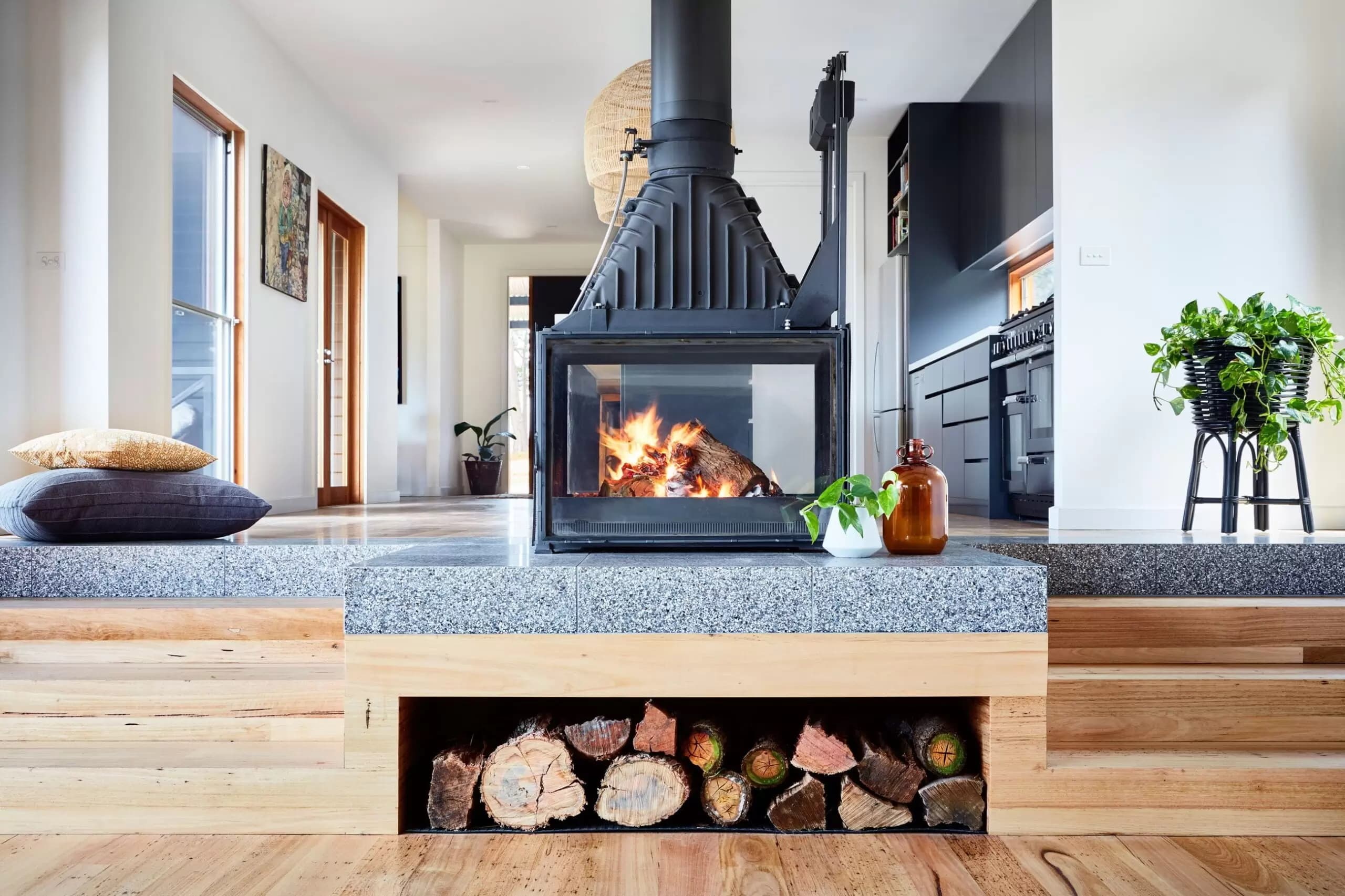 Двусторонний камин будет прекрасно смотреться в центре комнаты, создавая два жилых пространства, или может быть встроен в стену, где один огонь очаровывает и согревает две комнаты.