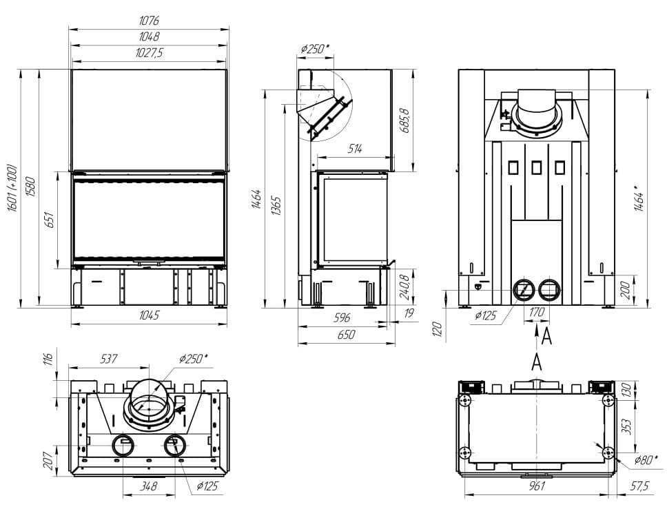 Устойчивые, регулируемые по высоте ножки (100 мм), позволяют при монтаже установить топку по уровню.