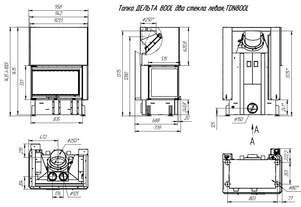 Каминная топка ДЕЛЬТА 800 R два стекла правая принтинг чертеж: