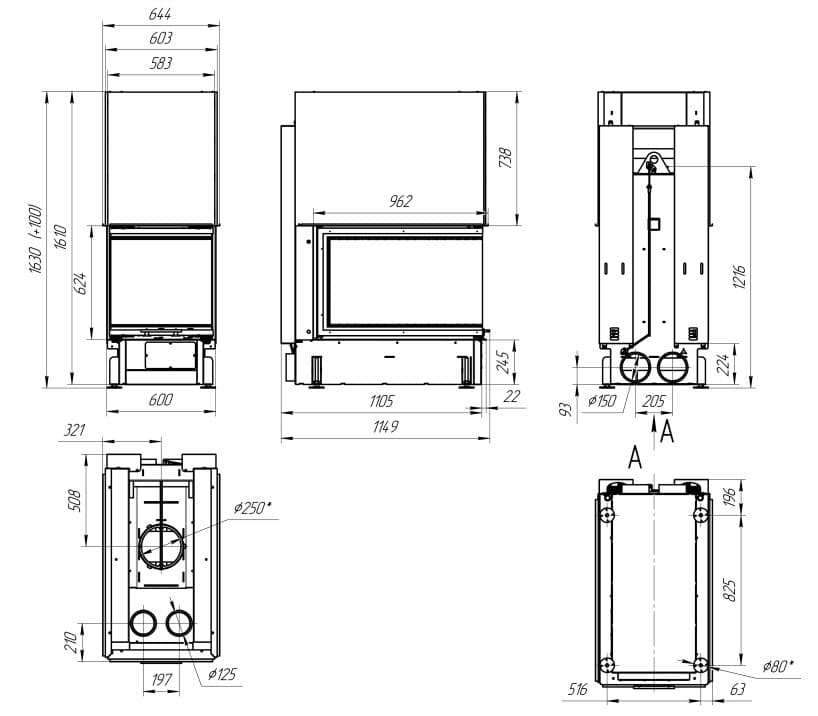 Устойчивые, регулируемые по высоте ножки (20 мм), позволяют при монтаже установить топку по уровню.