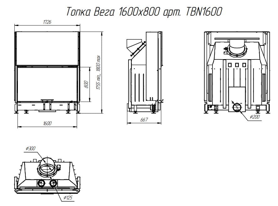 Каминная топка ВЕГА 1600 подовое горение чертеж: