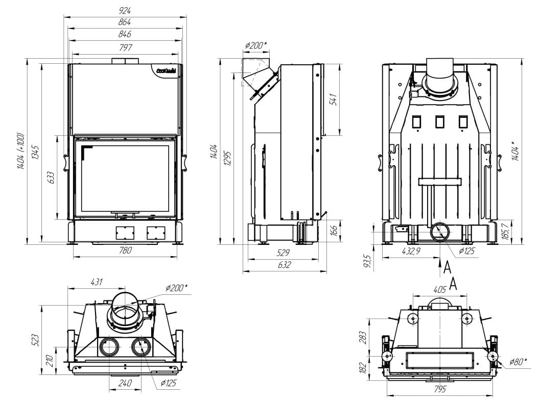 Ребра жесткости по всему корпусу топки и встроенные в дымосборник тепловые каналы позволяют снимать больше тепла и отдавать его в помещение путем конвекции. Высокий дымосборник и пламярассекатель не позволяют дымовым газам попадать в помещение при открывании дверцы.