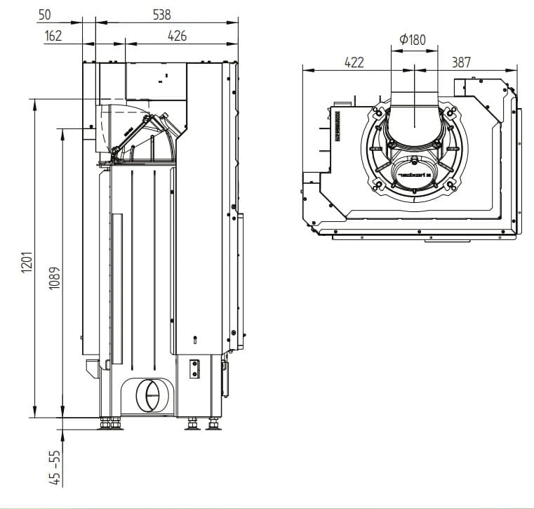 Габаритные размеры Каминная топка ECKA 67/45/51Rh Правосторонняя