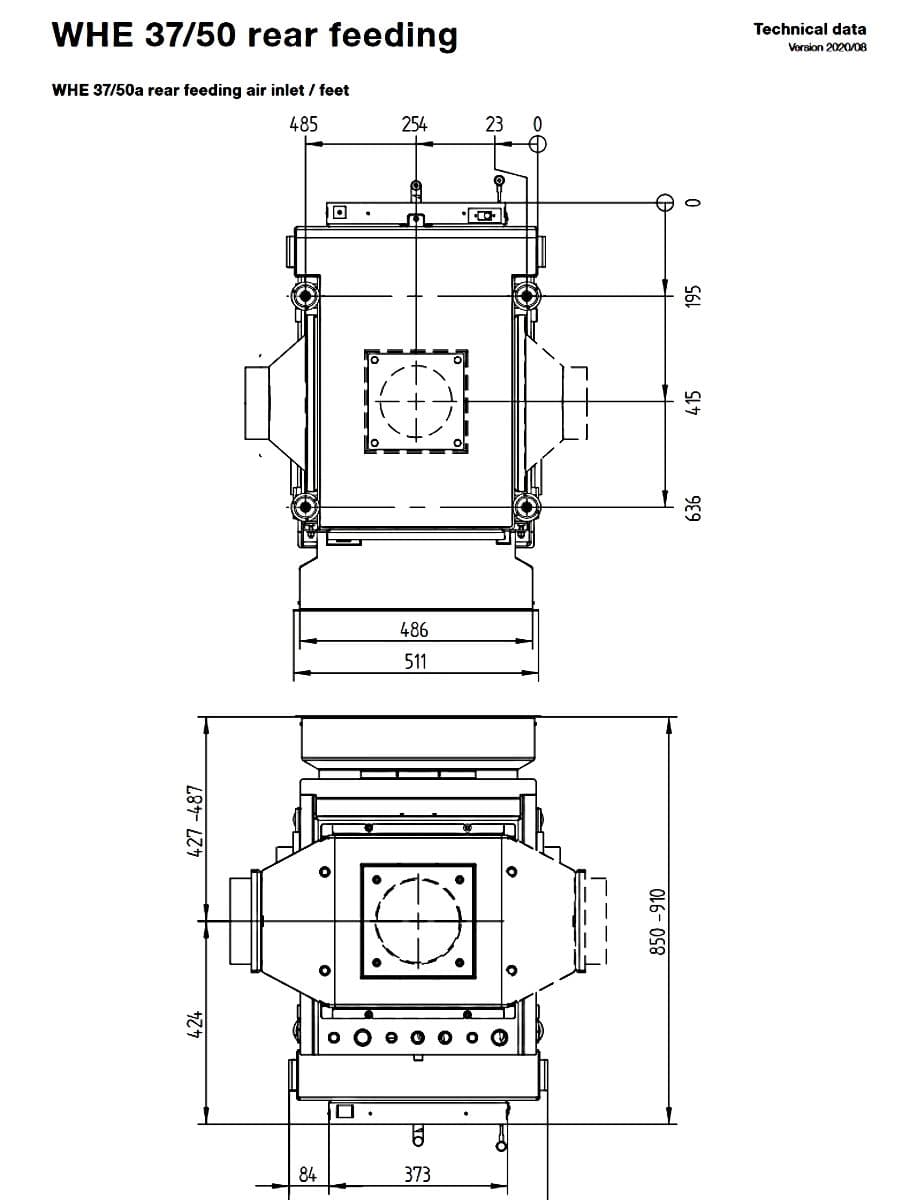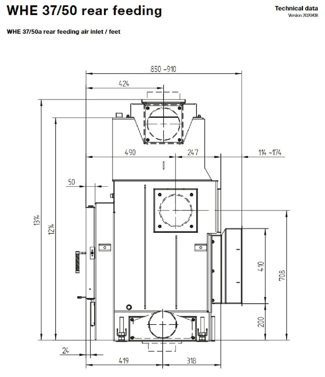 Габаритные размеры топки с водным контуром Hoxter WHE 37/50aWTR