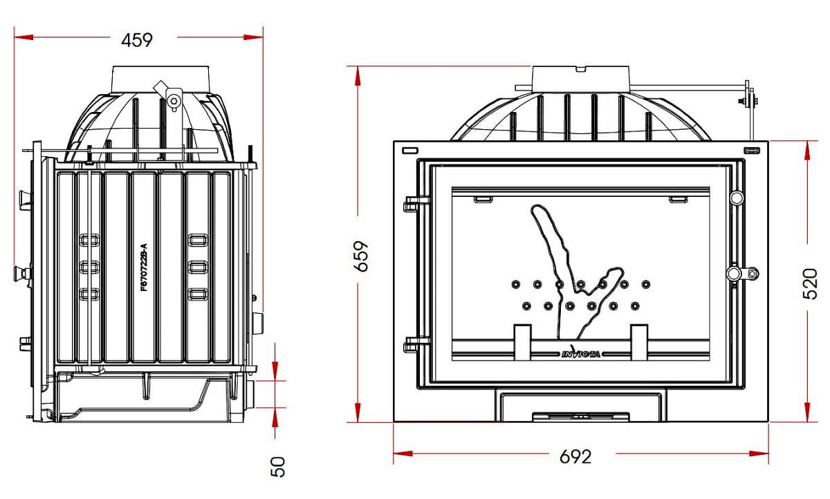 Небольшая по размерам каминная топка от Invicta 700 Milos Grand Angle способна для построения полноценного камина в загородном доме. В тоже время мощность топки 10 кВт, что может обогреть до 240 м3. При небольших размерах самой топки имеет достаточно большое стекло (520*690 мм), что позволяет насладиться игрой пламени. С технической стороны подключаемый дожиговой камин. Что касается дизайна, это изысканный стиль, который приглашает вас созерцать пламя.