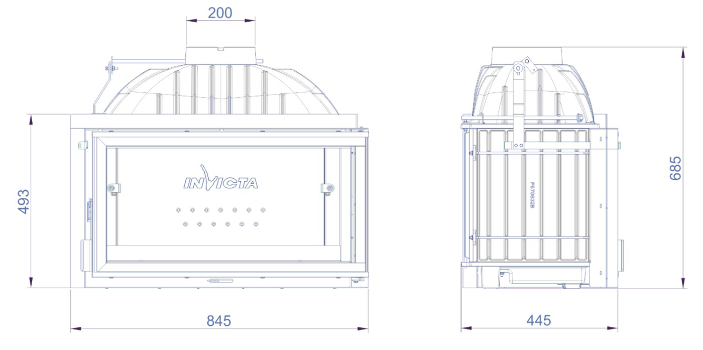 Модель оборудована дымосборником и шиберной заслонкой. Стекло составное декорированное черной фабричной тонировкой по краю - шелкографией. Задняя стенка у угловой чугунной топки Invicta 700 двойная с отверстиями для подачи воздуха на вторичный дожиг.
