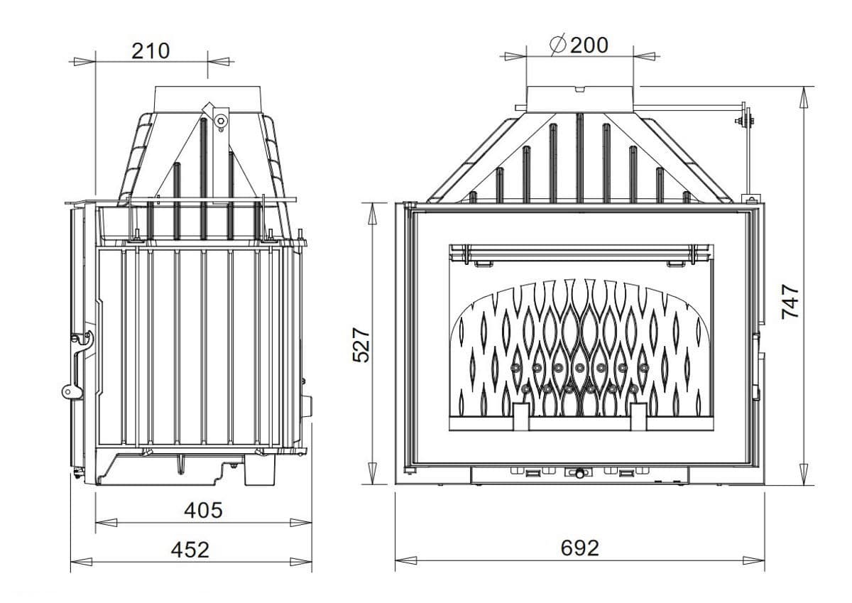 Модель оборудована дымосборником и шиберной заслонкой. Стекло составное декорированное черной фабричной тонировкой по краю - шелкографией. Задняя стенка у угловой чугунной топки Invicta 700 двойная с отверстиями для подачи воздуха на вторичный дожиг.