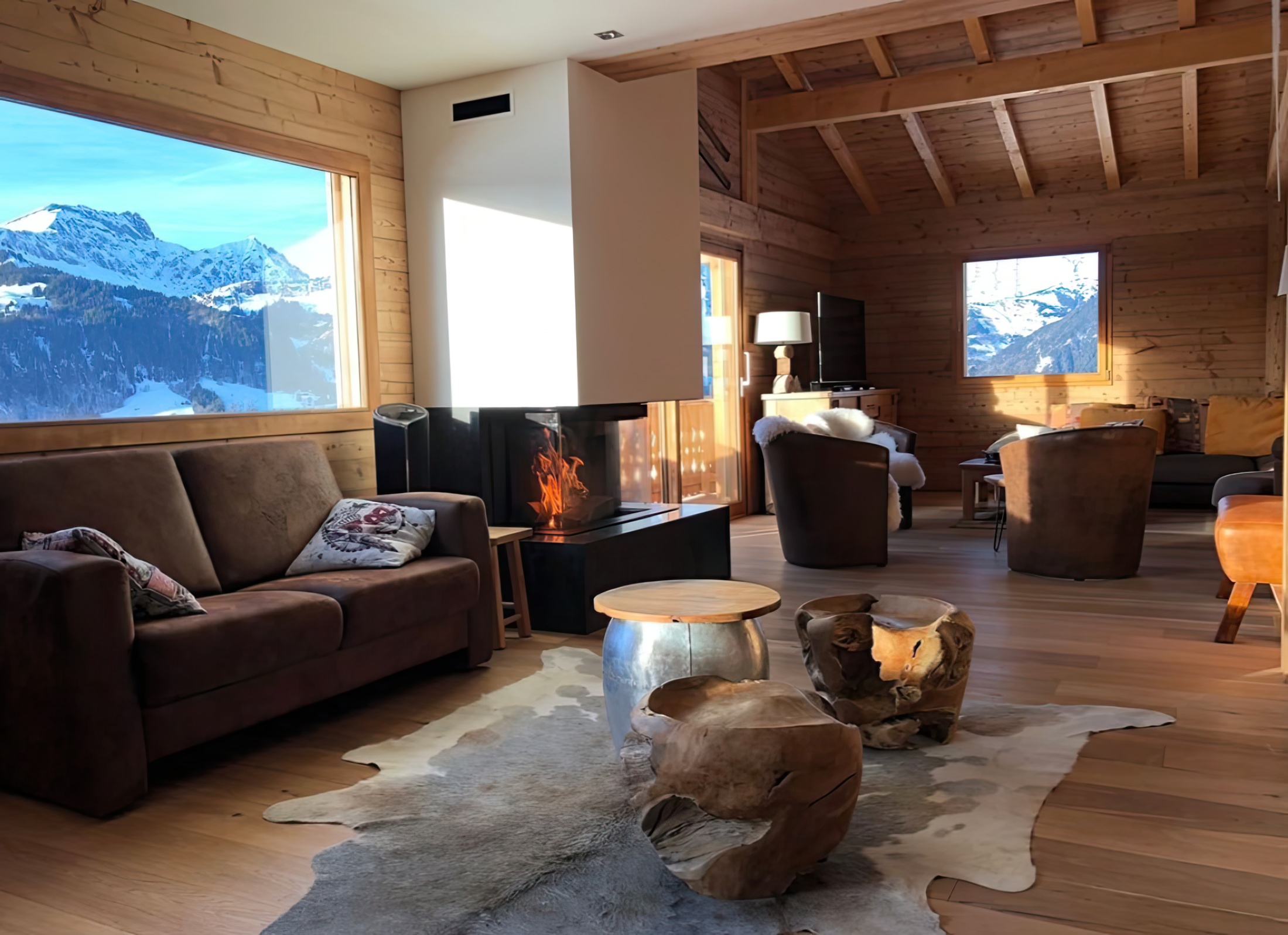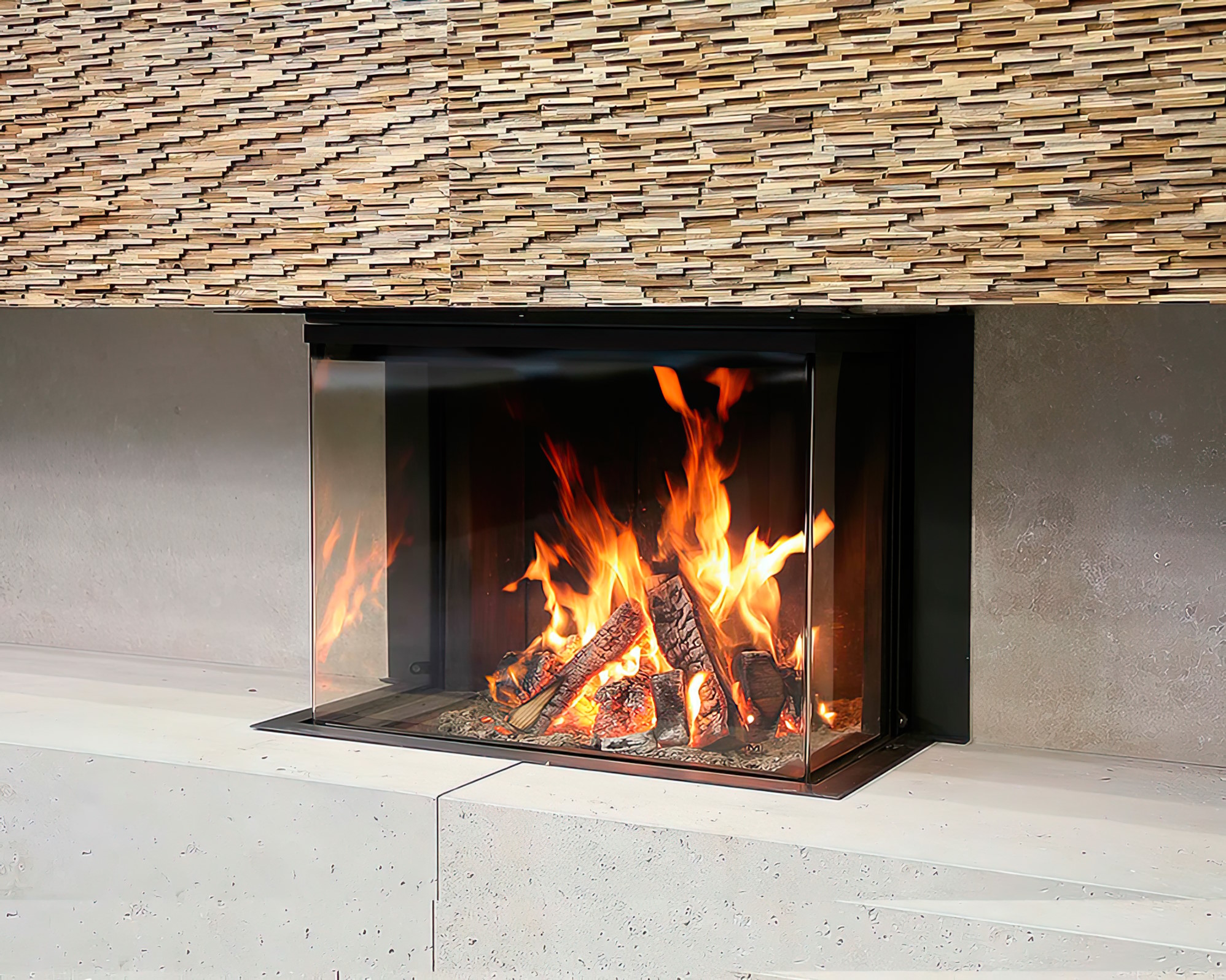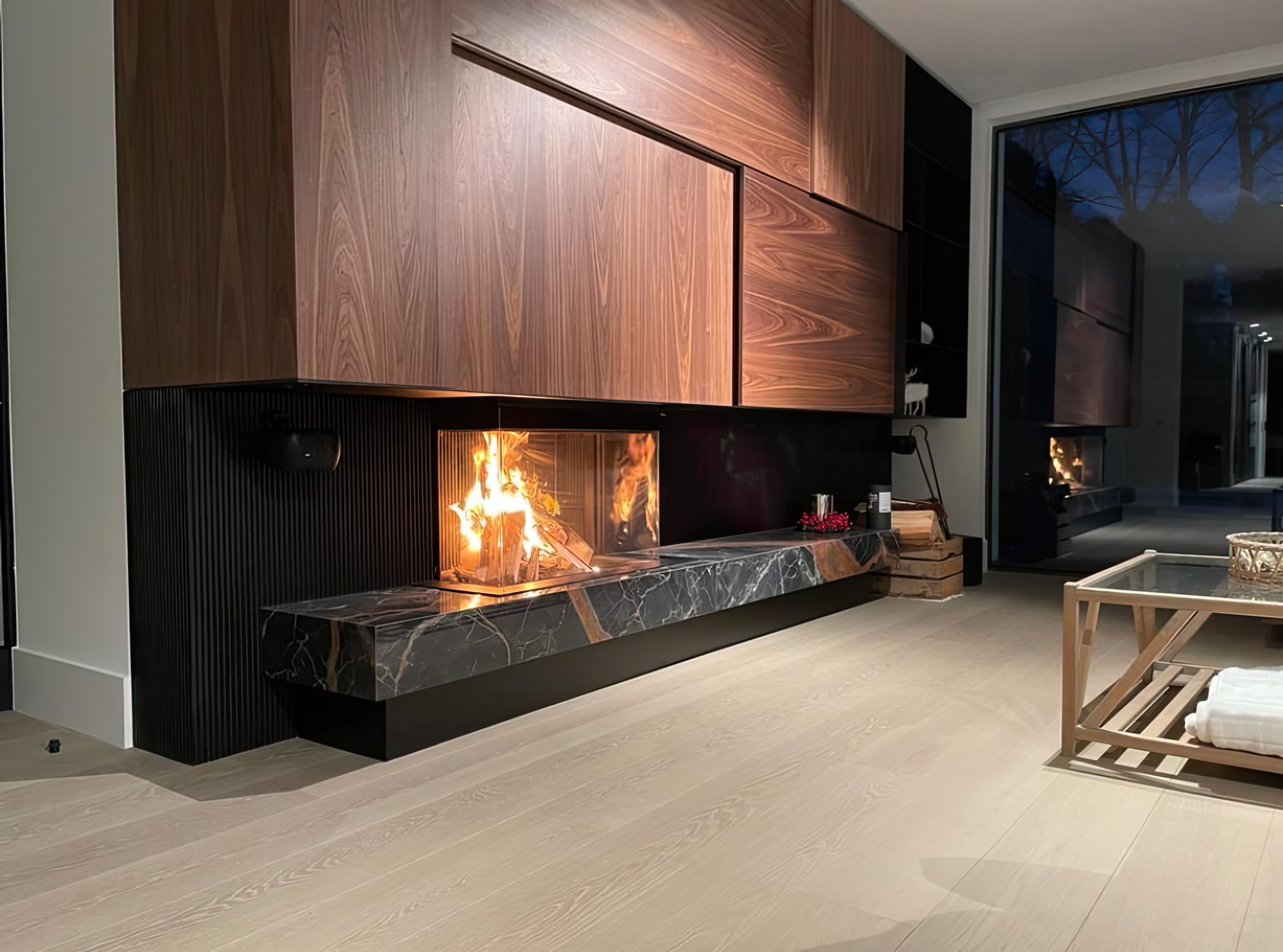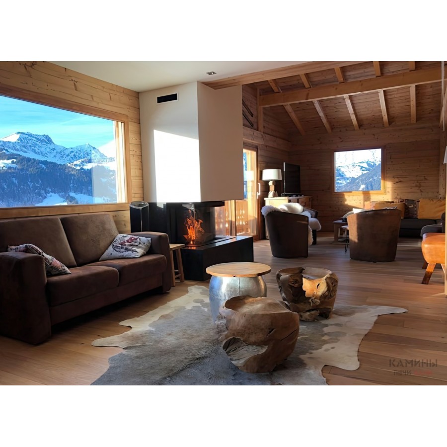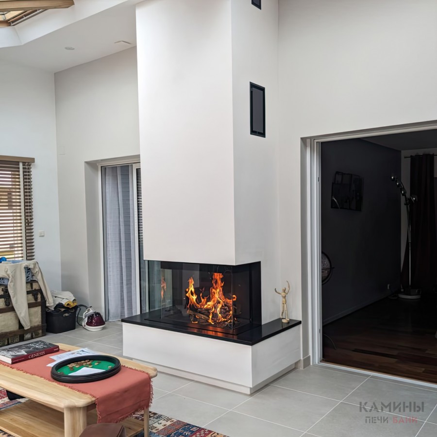 Угловой обзор: Г-образное стекло визуально расширяет зону камина и делает его доминантой интерьера.