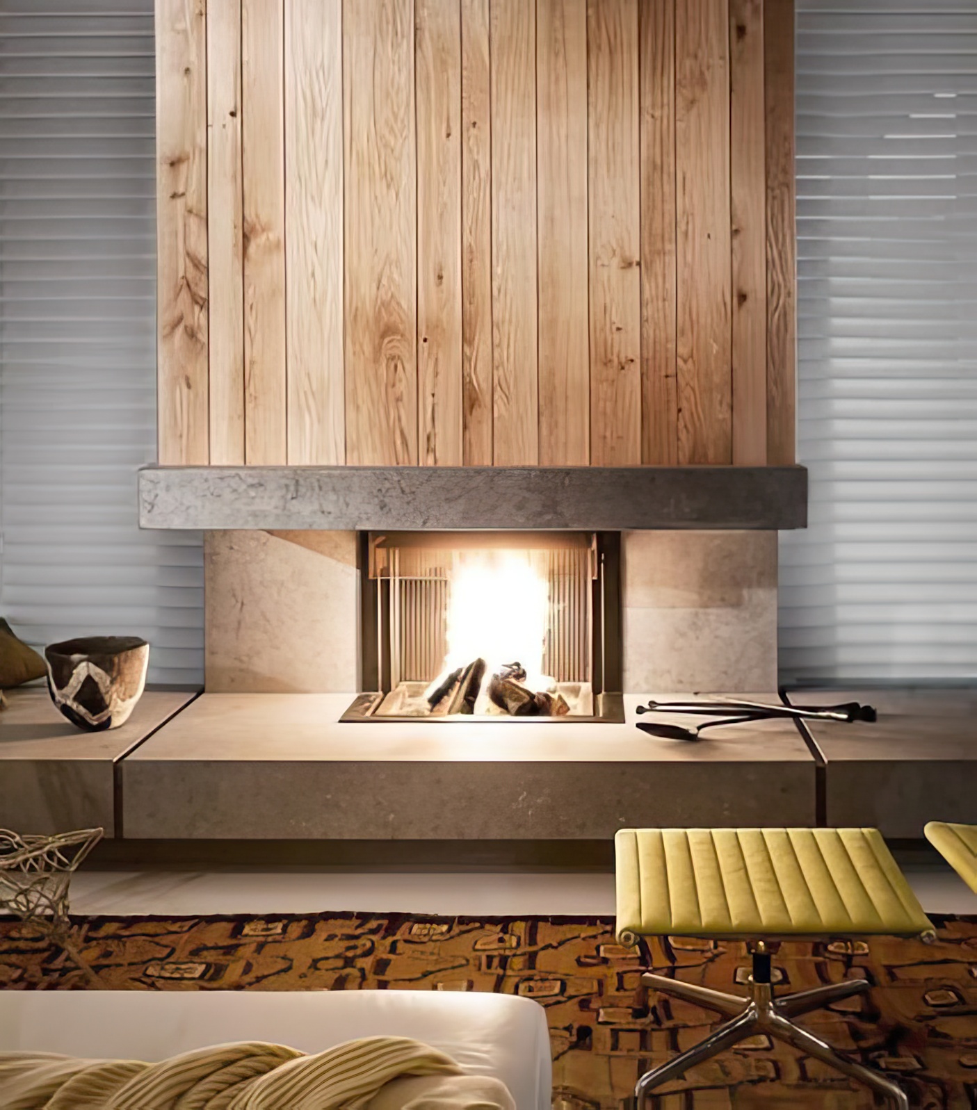 Угловой обзор: Г-образное стекло визуально расширяет зону камина и делает его доминантой интерьера.