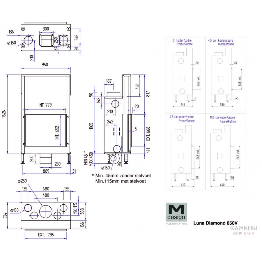Чертеж: На схеме важно отобразить габаритную ширину 950 мм (вместе с направляющими) и глубину 586 мм. Высота более 1.7 метра требует высокого потолка для размещения дымоходного колена.