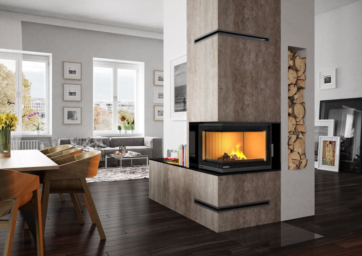 Основной особенностью угловой каминной топки Torn является наличие стекла с шелкографией, закрывающего полностью дверную рамку. Стекло имеет по периметру тонировку, которая скрывает за собой рамку двери и уплотнительные шнуры. Таким образом после возведения каминного короба стеклянная дверь заполнит практически всю видимую часть проема. Такая дверца воспринимается визуально больше, чем обычная дверка с чугунной рамкой и выглядит более привлекательно.Угловая каминная топка Nordflam Torn Right изготовлена из чугуна.Отбойник (верхний зуб или дефлектор) выполнен из вермикулита, что позволяет, увеличить температуру внутри топочной камеры, тем самым способствуя более полному сгоранию дров, увеличению КПД, и, что самое важное, лучшему выгоранию сажи со стекла. Также дефлектор продлевает путь дымовых газов, увеличивая теплоотдачу от камина в помещение.