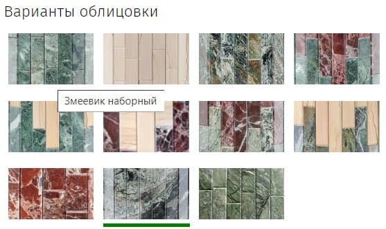 Варианты облицовки: Змеевик, "Окаменевшее дерево", Жадеит, Змеевик+Россо Леванте, Змеевик+"Окаменевшее дерево", Россо Леванте + "Окаменевшее дерево", Жадеит + Россо Леванте, Жадеит+"Окаменевшее дерево", Россо Леванте наборный, Жадеит перенесённый рисунок, Верде Гватемала.