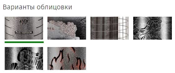 Варианты облицовки: кожух лайн, дуб, сетка, русалка, шайка-лейка, пламя.