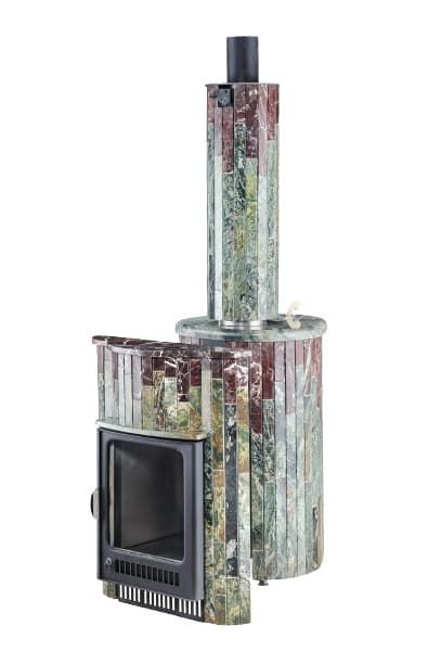 Печь для бани от производителя VÖHRINGER серии Малютка ПФ 18 Жадеит + Россо Леванте. Она рассчитана для установки в парной объёмом до 18 м3.
