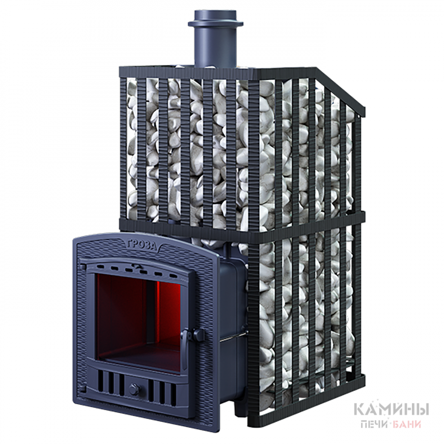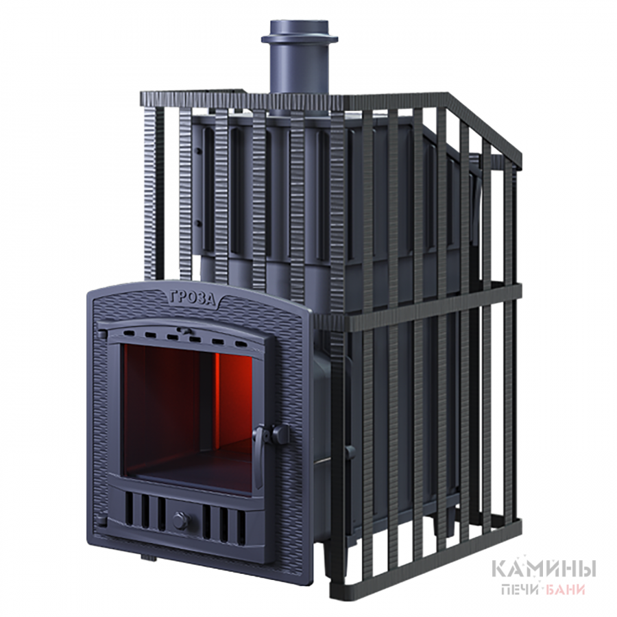 Печь для бани GROZA 24 (П)2 Ураган - расширенный комплект печи в сетке. Максимально приближенный вариант печи для режимов русской парной, имеющий непосредственно закрытую чугунным коробом каменку, дверцу для пара с ручкой из бука, увеличенную до 50 см чугунную стартовую трубу. Печь легко модернизируется до полноценной печи предназначенной для Русской бани путем замены стальной сетки на каменную облицовку без демонтажа дымохода.