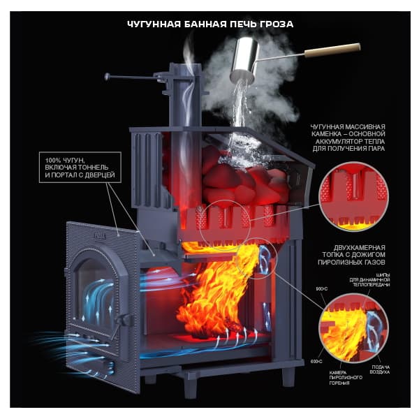 Чугунные банные печи ТМ «Гроза» — это современные печи, рассчитанные на малые и средние размеры парных.