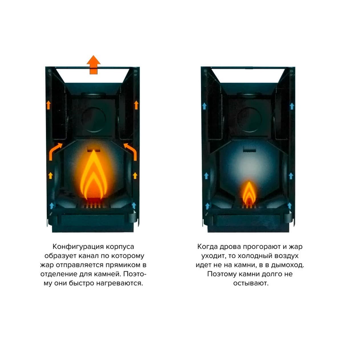 - Передовая система воздухообмена Коанда позволяет быстрее протопить сауну меньшим количеством дров, эффективно прогревая каждый камешек.