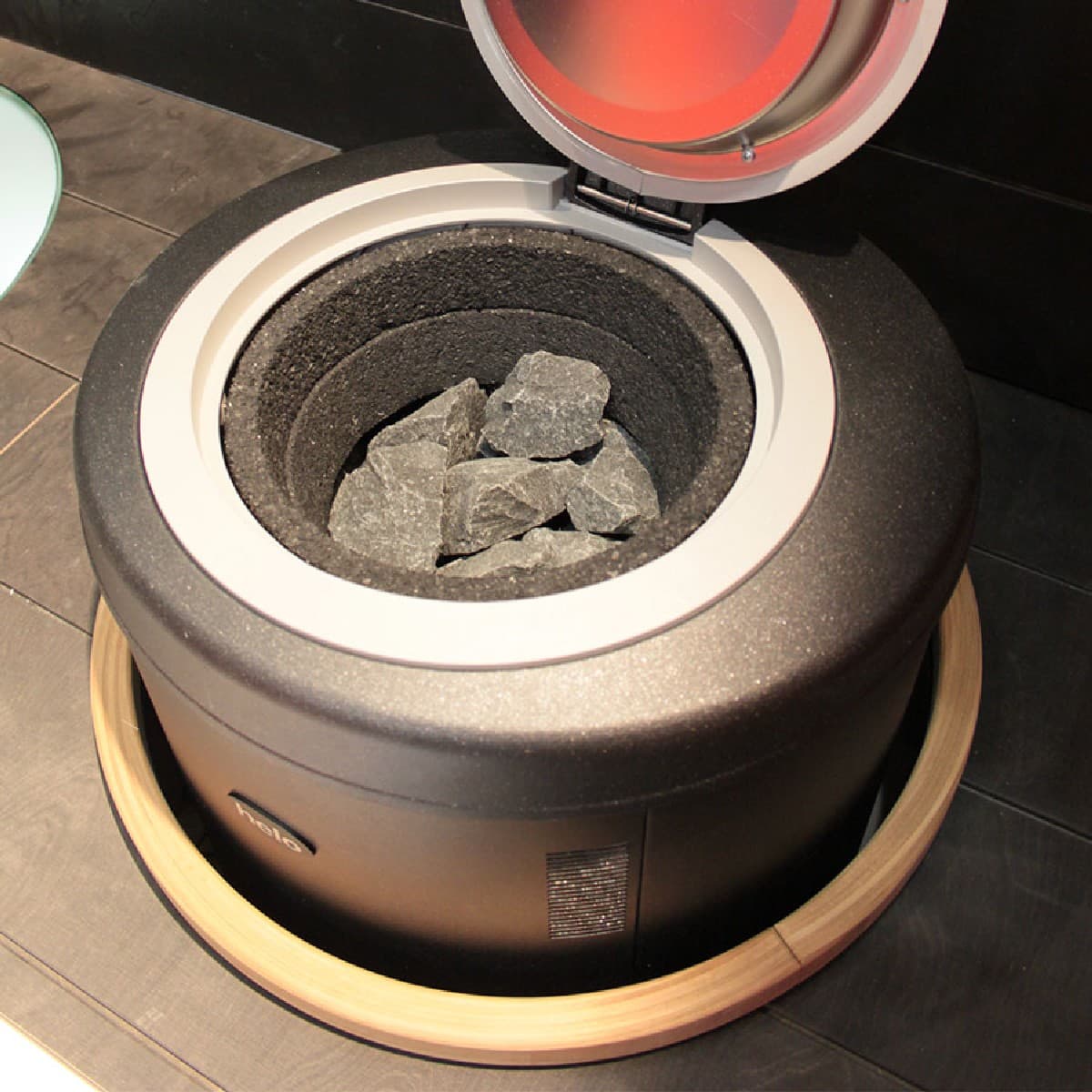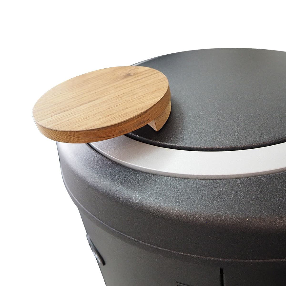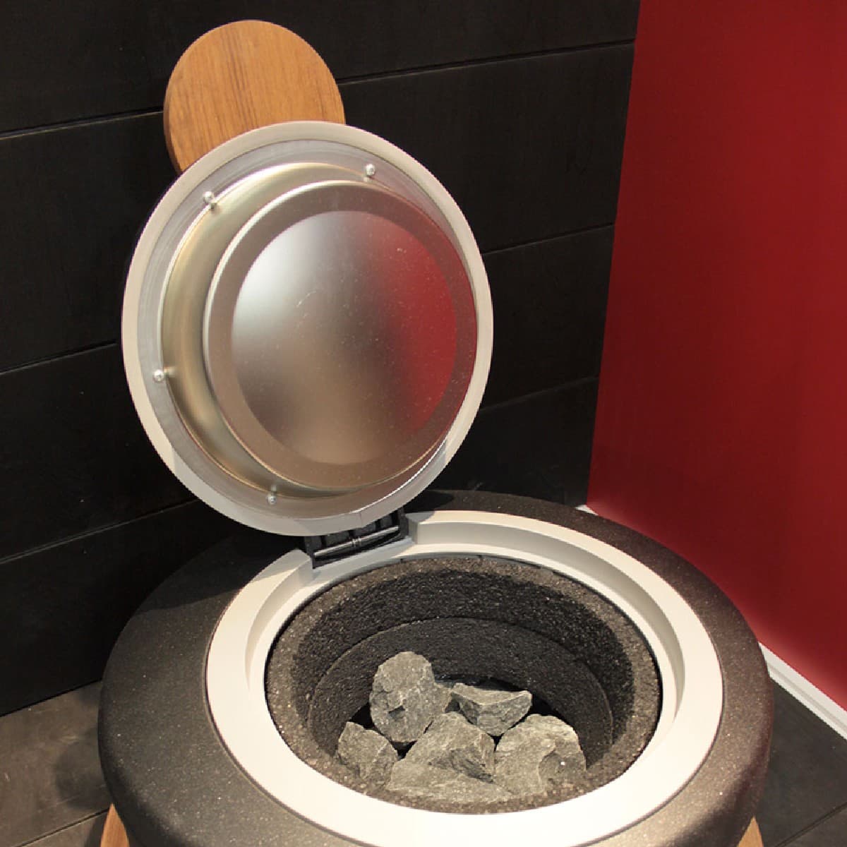 Поворотная крышка с деревянной ручкой обеспечивает удобный доступ к камням.