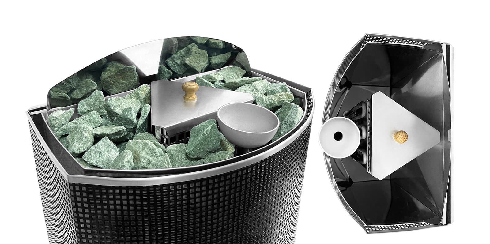 При достижении показателя заданной температуры, электрокаменка полностью не отключается, а работает на постоянной основе в 50% от максимальной мощности, чтобы камни в печи всегда были горячие и давали пар. В отличии от любых аналогов (где печь отключается целиком, и камни становятся холодные). При понижении температуры в парной на 2-3 ℃ от заданной, вторые 50% мощности подключаются, и каменка начинает работать в полную мощность.