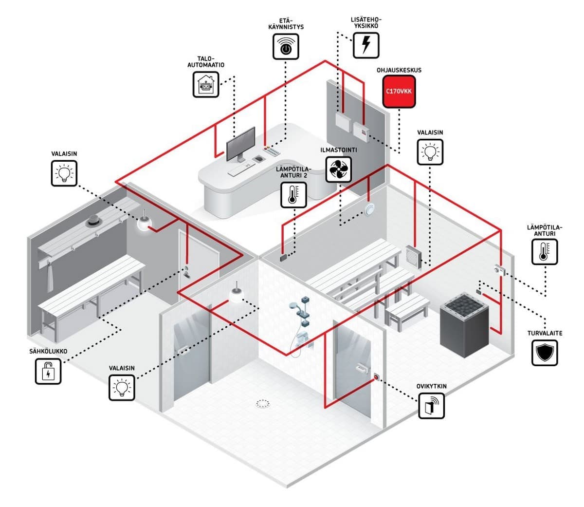 C170VKK является обновленной версией пульта управления C150VKK, который стал настоящей классикой среди профессионалов. Помимо непосредственного управления каменкой сауны, пульт управления также можно использовать для регулирования освещения в помещении, управления электронными устройствами блокировки и вентиляцией. Устройство имеет слоты для восьми различных программ, которые позволяют автоматизировать настройки, например, для определенного времени или разных пользователей. C170VKK является прекрасным выбором для жилищных компаний, спа-салонов, гостиниц и других общественных саун.