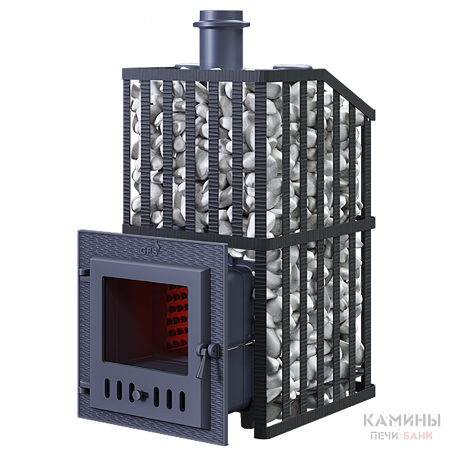 GFS Гефест ЗК Ураган 18 (М) - расширенный комплект печи GFS Гефест ЗК в сетке. Максимально приближенный вариант печи для режимов русской парной, имеющий непосредственно закрытую чугунным коробом каменку, дверцу для пара с ручкой из бука, увеличенную до 50 см чугунную стартовую трубу. Печь легко модернизируется до полноценной печи предназначенной для Русской бани путем замены стальной сетки на каменную облицовку без демонтажа дымохода.