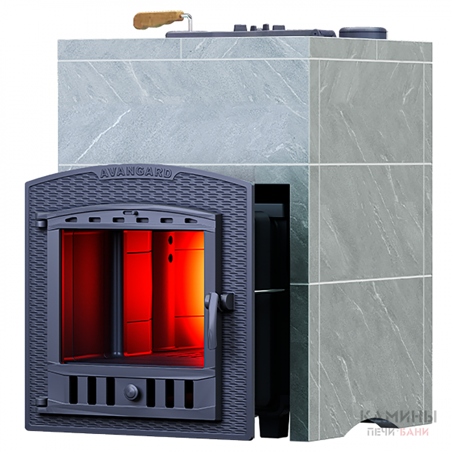 Основным парообразователем в печи Авангард является каменка прямого нагрева. С нижней стороны выполнены полые выступы, которые со всех сторон охватываются пламенем, а с верхней стороны они образуют воронки. Попадая в воронки – вода оказывается в самом раскаленном месте заряда образуя легкий мелкодисперсный пар уже через 30 мин после растопки.
